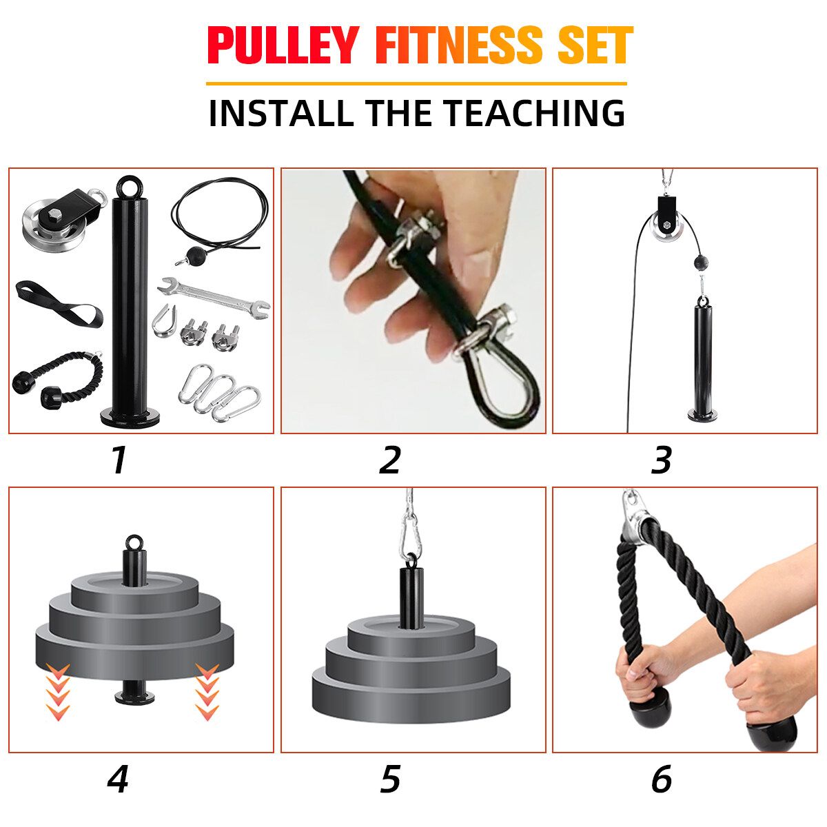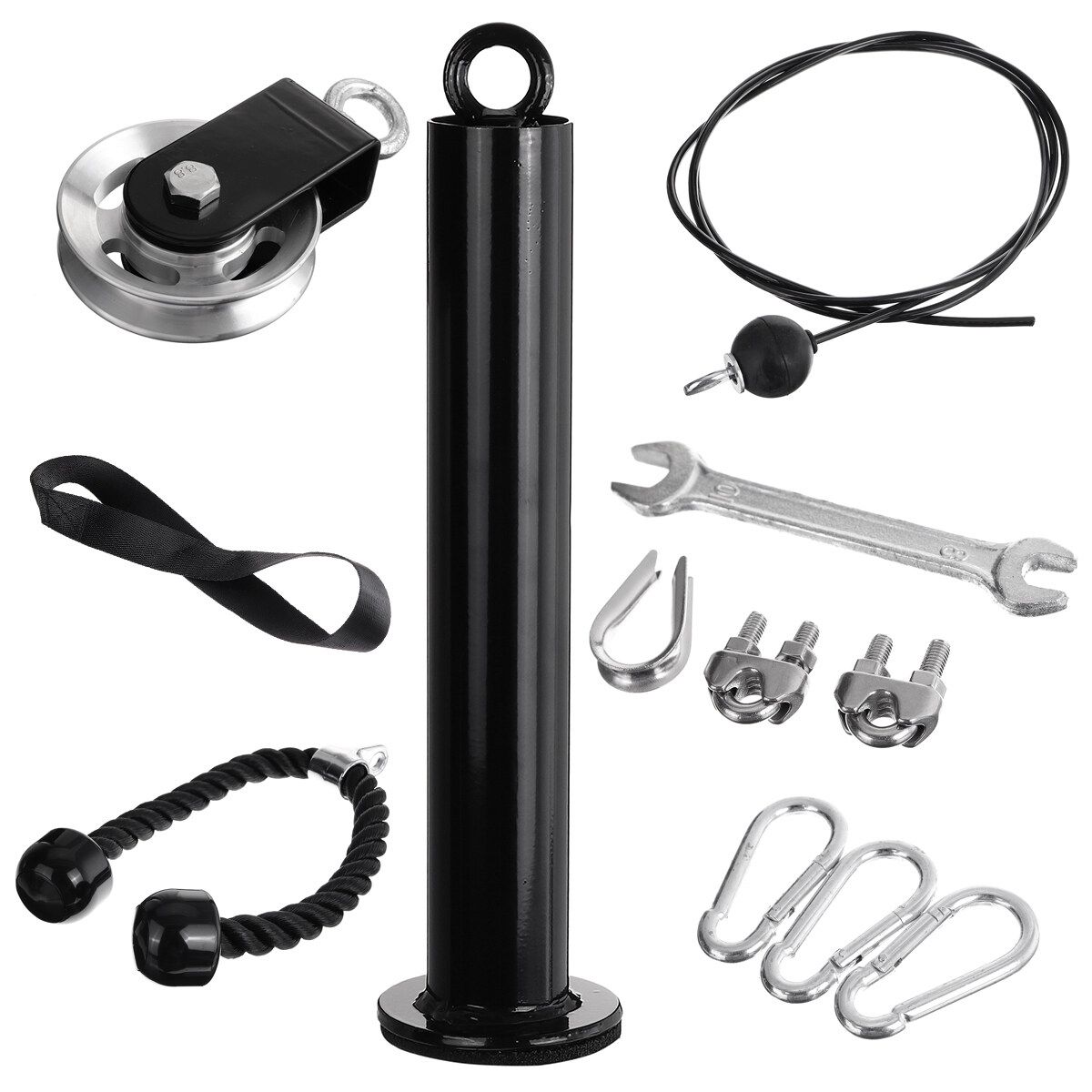 1 x Loading Pin 1 x Pulley 1 x Strap for fixing the pulley 1 x Pulley Hanging Cable 3 x Cable Security Parts 1 x Wrench 1 x Tricep Straps 3 x Carabiners