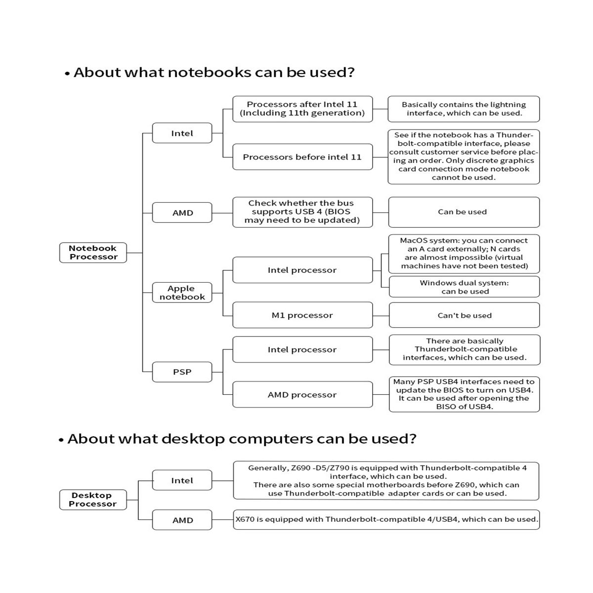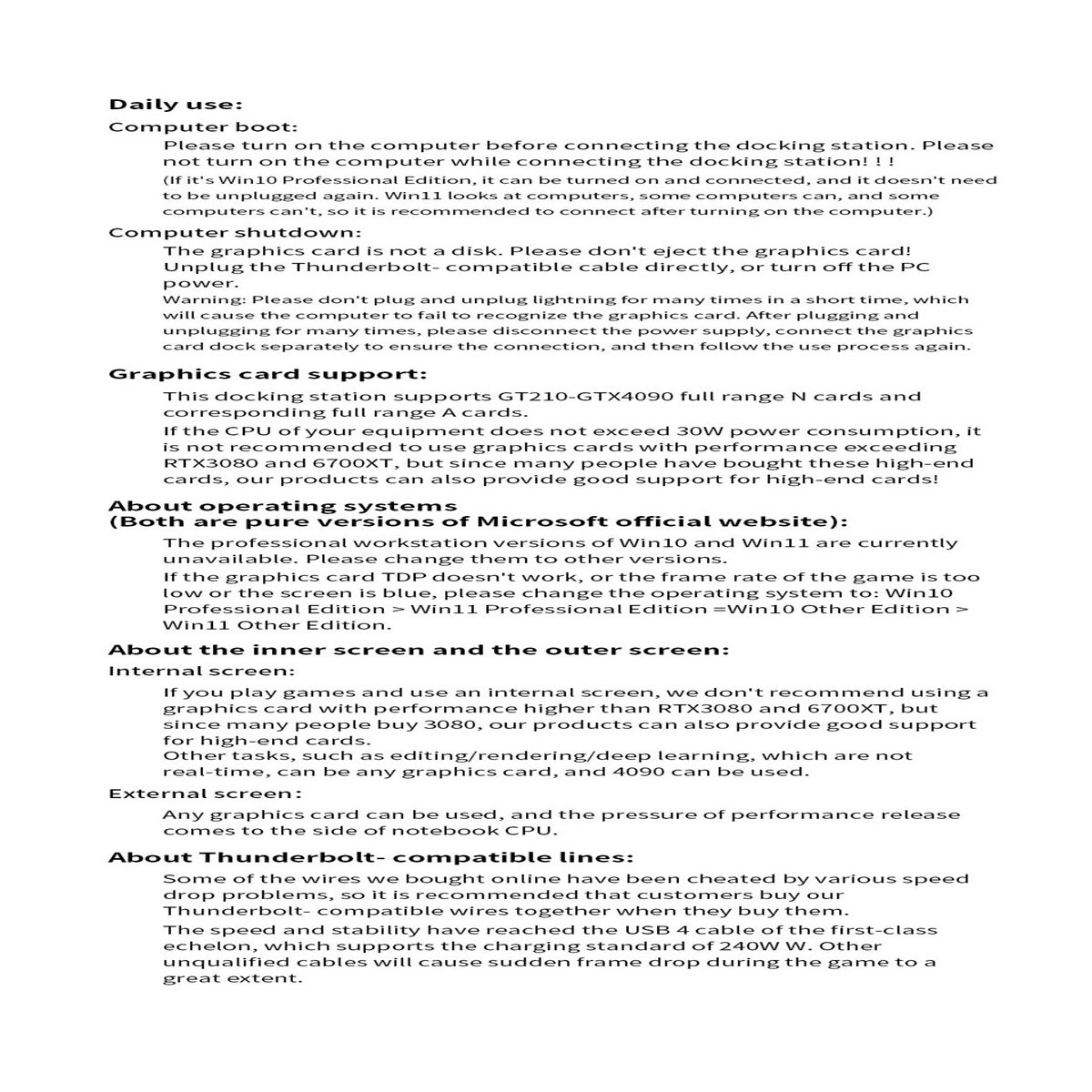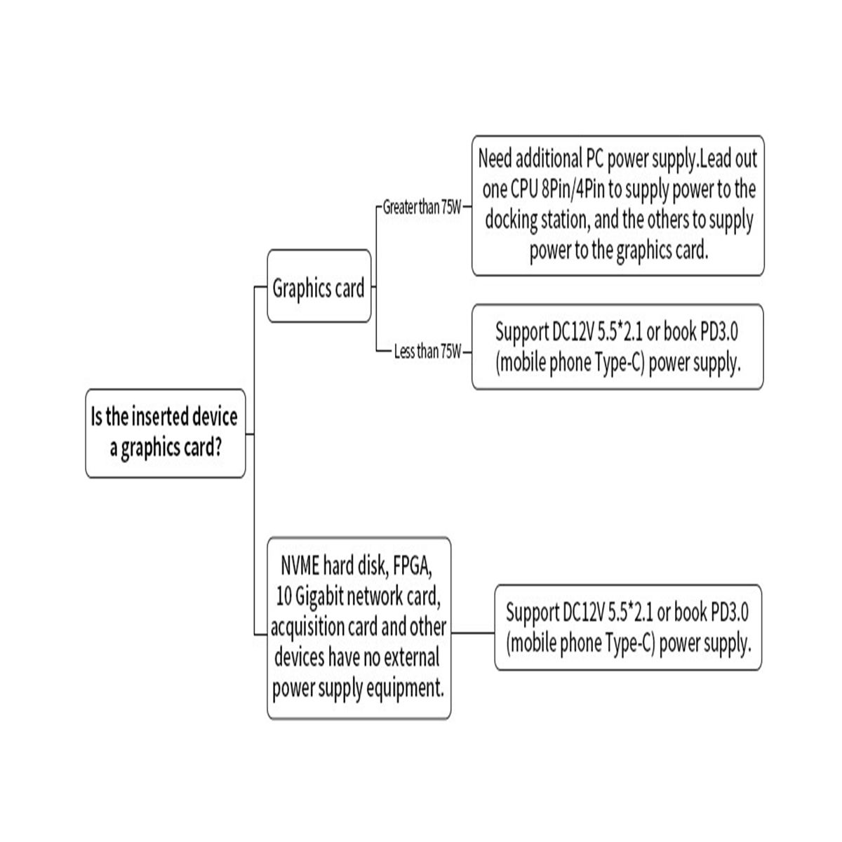3 About reverse charging Because the reverse charging has been tested for a long time beforeit is not guaranteed to be 100% okso it is not added to this productwhich is easy to burnthe motherboard 4What should be prepared for use You need to prepare PCpowersupplyDCpowersupplyThunderbolt-compatible cableUSB 4 data cable accordingto vour externalequipment