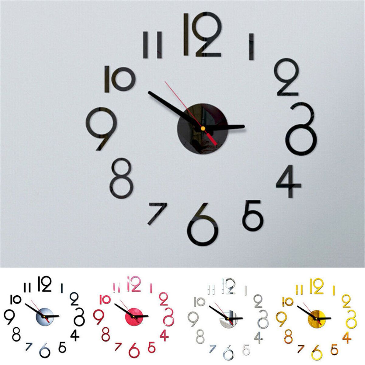 Description 5 3D Clock DIY Acrylic Mirror Wall Sticker Simple FashionNumber TV Backdrop Home Decoration Decor Art Specification: Material: Acrylic : Black, Silver, Dark Gold, Light Gold, Red Size: approx. 40x40cm Package Weight: approx. 65G Mode: 2x AA Dry (Not Included)