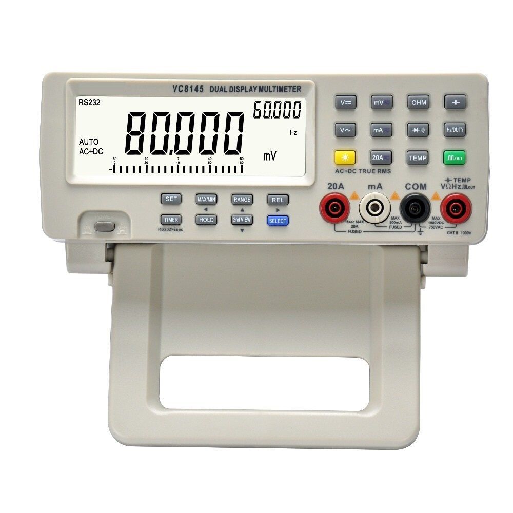The Professional Bench Top Multimeter is a unique multi-functional device that has 4 7/8 digits Dual Display with 80,000 counts and Analog Bar Graph with 23 segments. This precision LCR meter is a cost-effective solution for component and material measurement. Measure speed is about 3 per second and with more than 50 measuring functions including DC/AC Voltage, DC/AC Currents, Resistance ( Omega;), Capacitance, Frequency (Hz), Rotational Speed,Temperature (C/F), Duty Cycle, Diode and Continuity Check. Moreover, you can connect it to your computer through RS-232 Cable. The meter can provide functions including analog bar and unit symbol display, data holding, relative value measuring and maximal/minimal value measuring. This multimeter is most suitable for use on production lines, laboratories, factories, radio-technology, R amp; D, maintenance and repairing work. The meter can provide functions including analog bar and unit symbol display, data holding, relative value measuring and maximal/minimal value measuring.