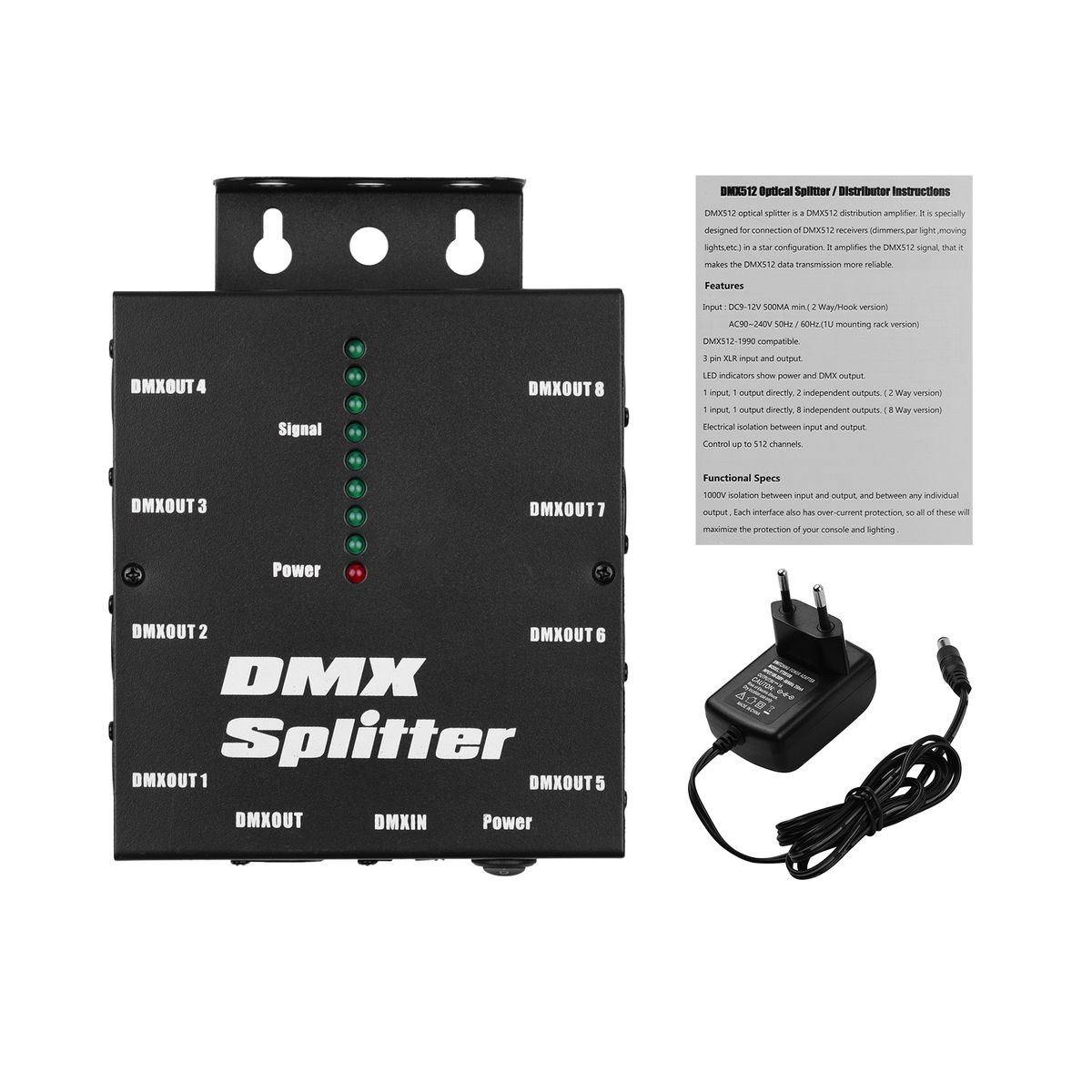 Comes with 1 input, 1 output directly, 8 independent outputs, avoid the system after the class DMX signal interference and destruction and greatly save your setup time and the use of cable.