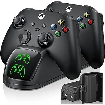 Compatible with Xbox series x. This Dock Fast charges two controllers statteryimultaneously.it comes with a free battery for the xbox series x controller and a free cable.it also has a led display indicator feature which indicates battery status.