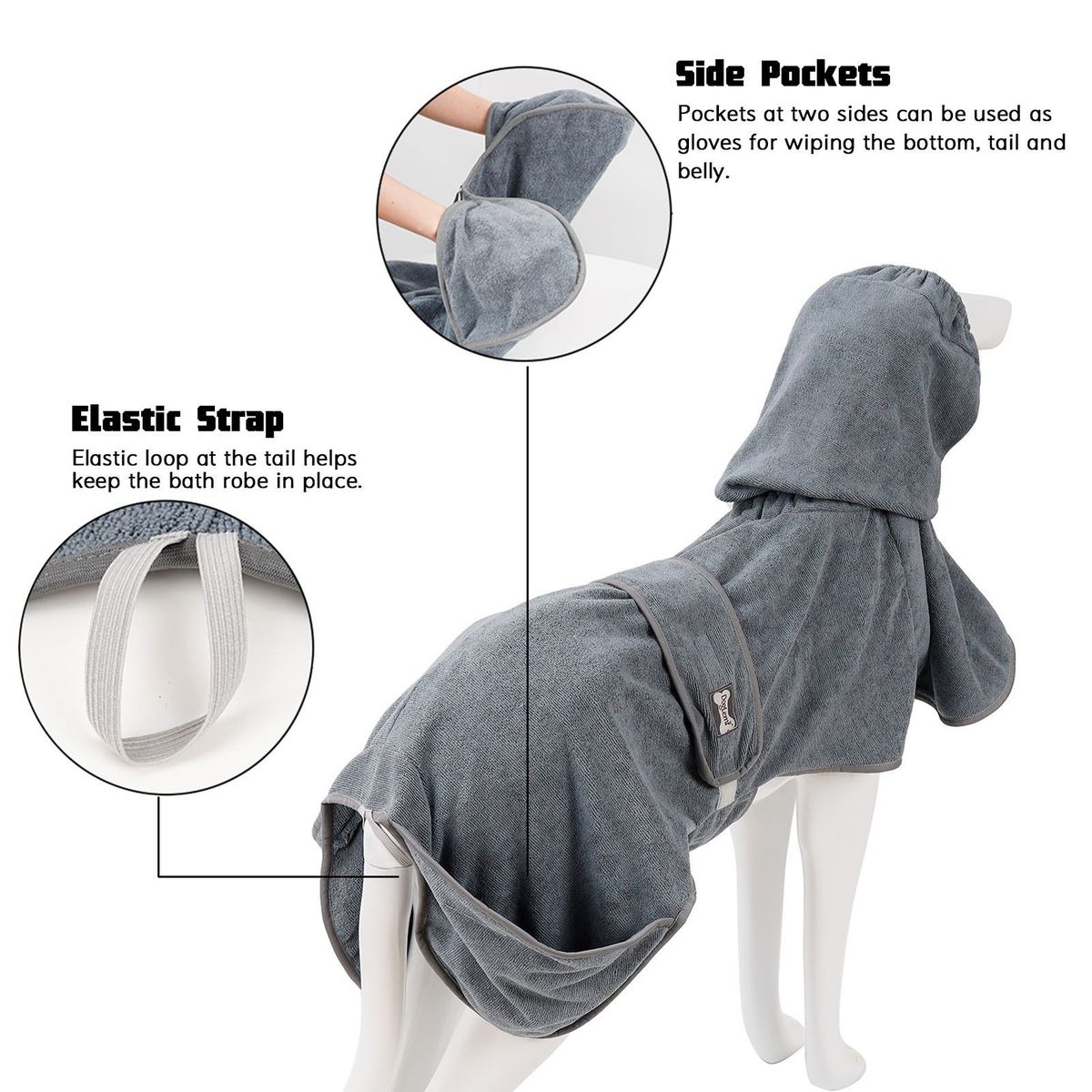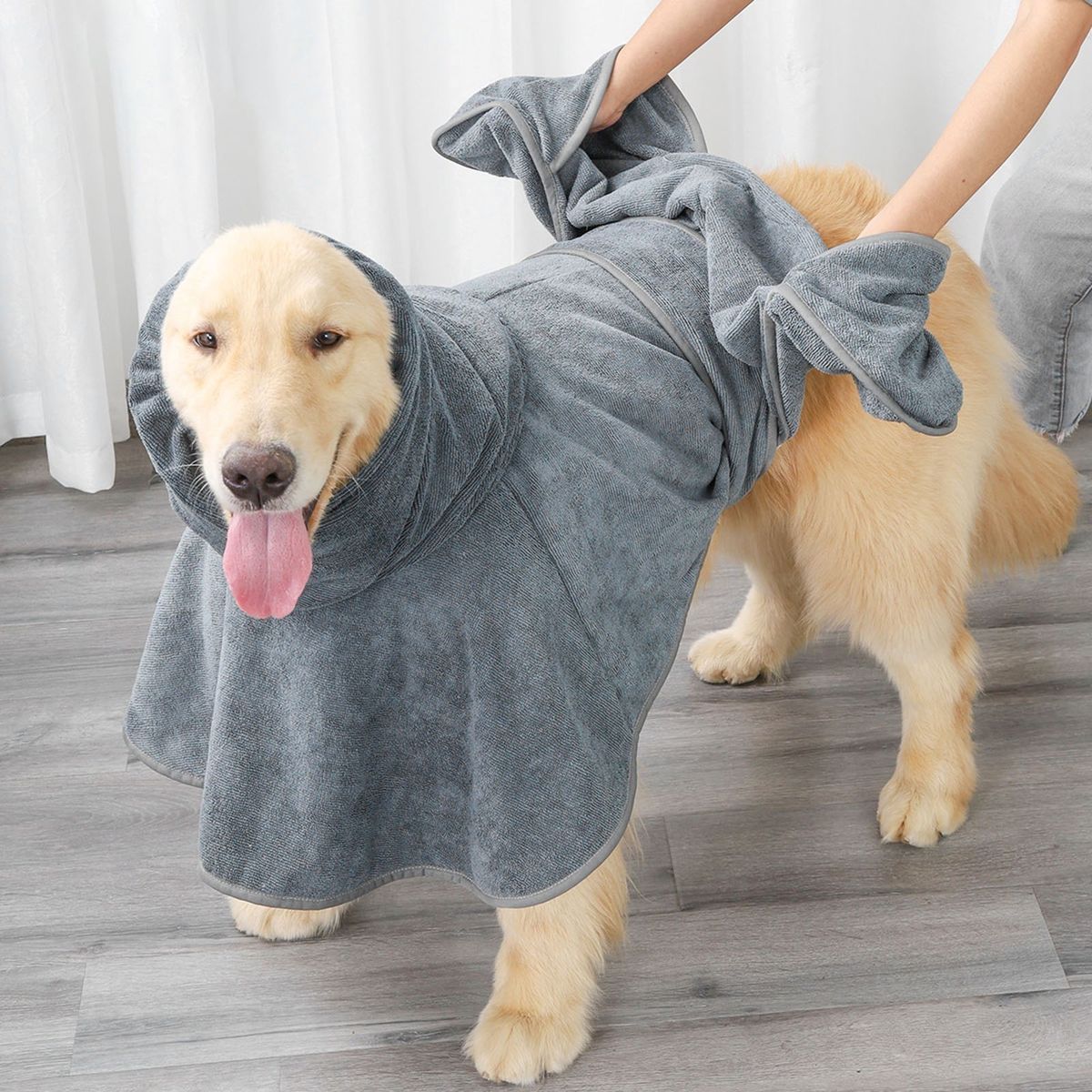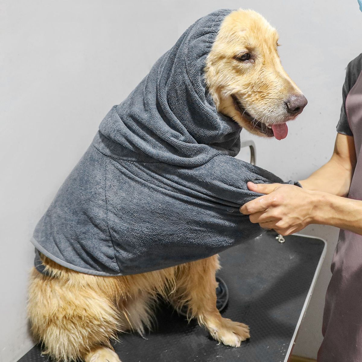 Wearable bath towel for your dog. It has high absorbent and quick-dry fabric, elastic hood and adjustable waist strap for a comfortable fit. The side pockets are convenient to put your hand in and wipe your dog easily.
