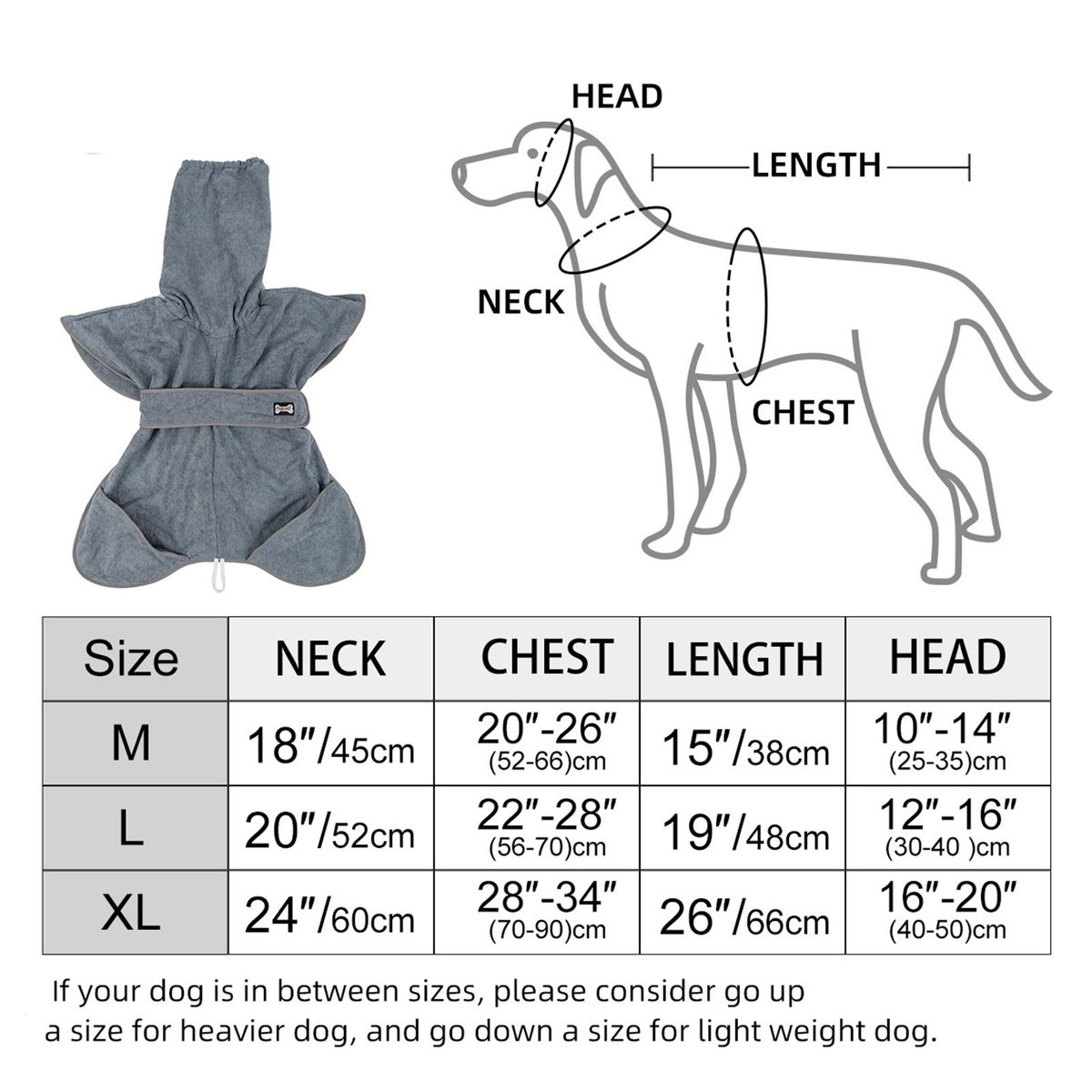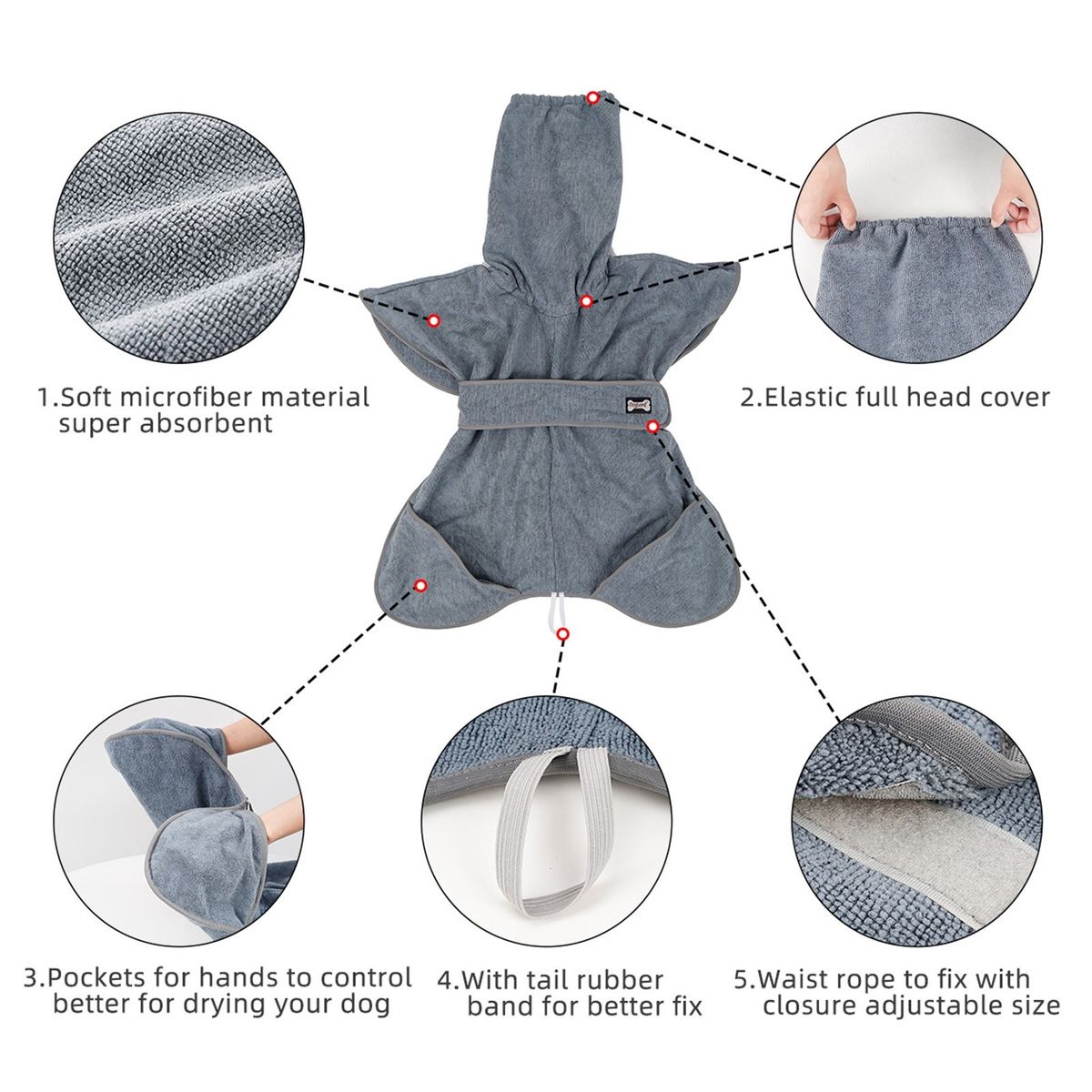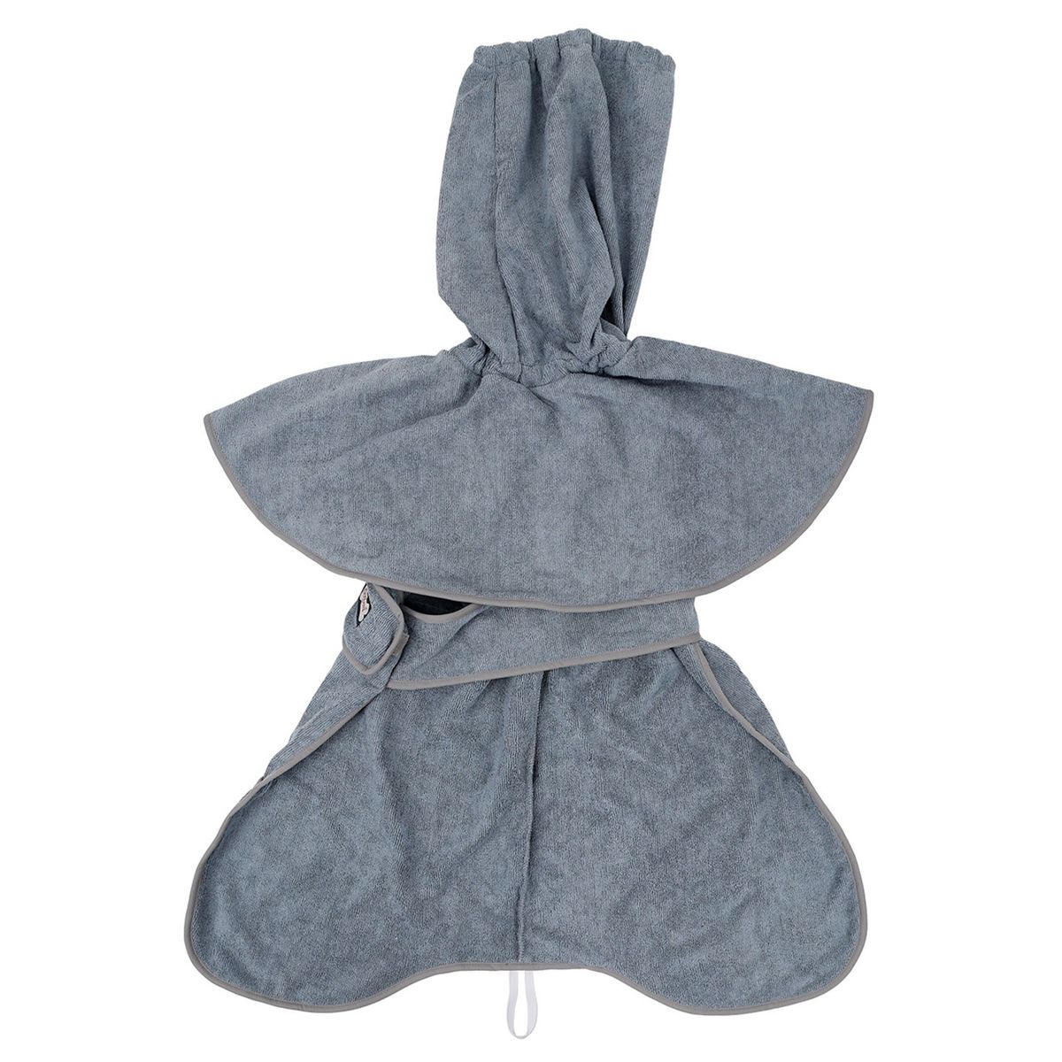Wearable bath towel for your dog. It has high absorbent and quick-dry fabric, elastic hood and adjustable waist strap for a comfortable fit. The side pockets are convenient to put your hand in and wipe your dog easily.
