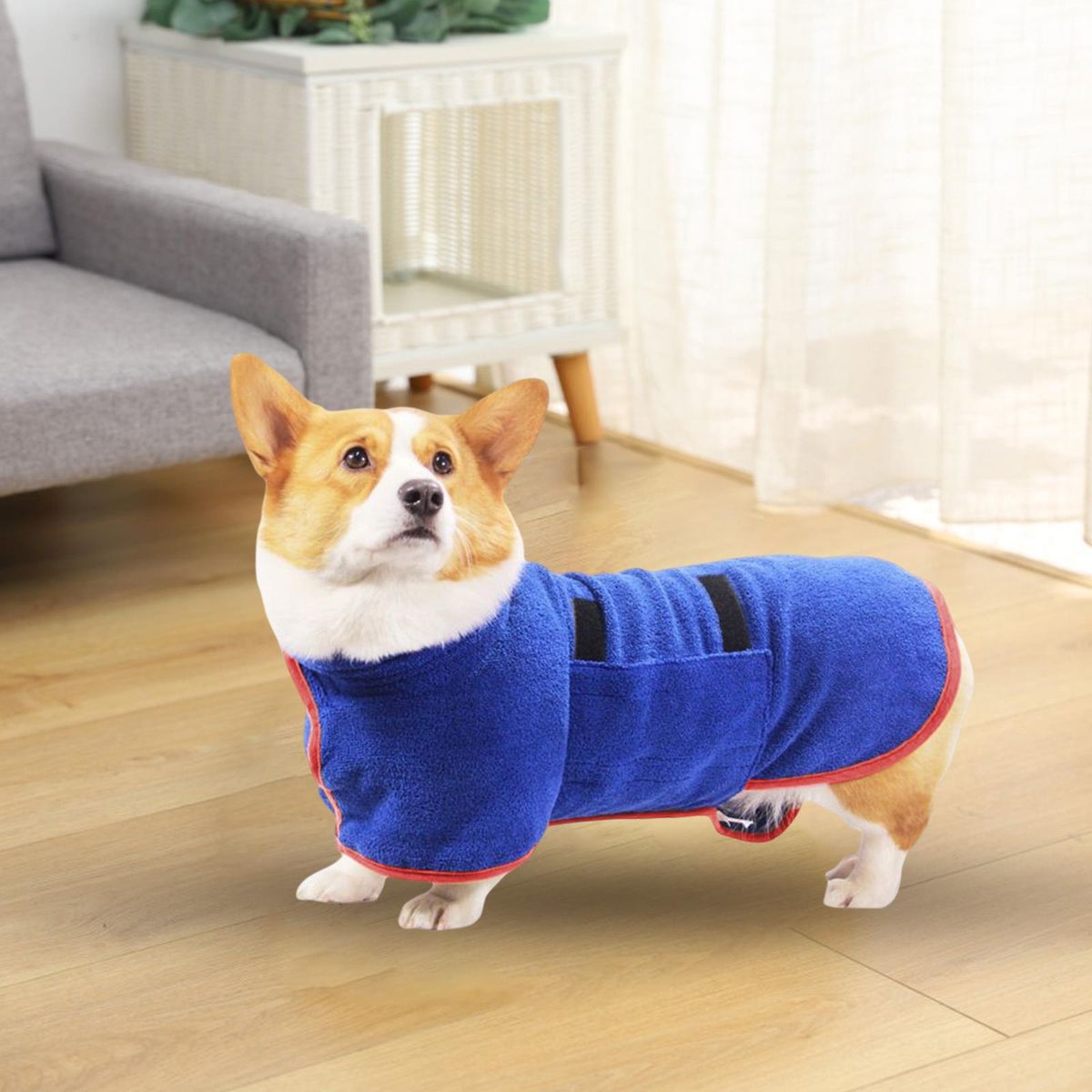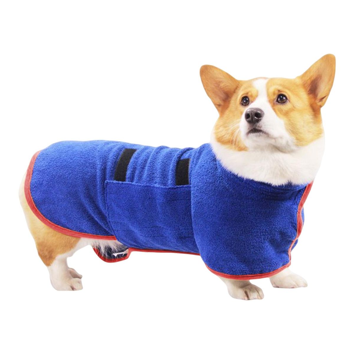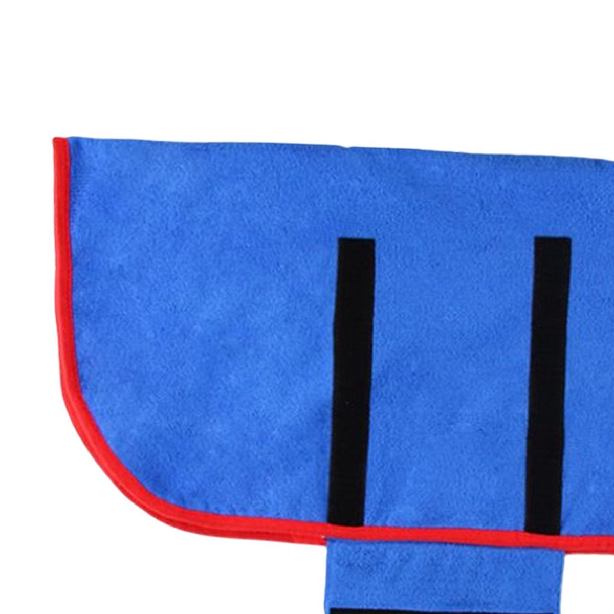 Durable: The bathrobe towel is made of polyester and nylon,very durable.Quick Drying: It can absorb moisture quickly, effectively save the time to dry after taking bath, swimming.Comfortable: The material is also very soft, it is comfortable and portable, easy to take when go out swimming with your pets.Adjustable: This bathrobe towel is with long tape for you to wear comfortable properly for your pet.Easy to Use: The design is very simple ,you can just put it on and off off by the adjustable adhesive tape under the dog's stomach.