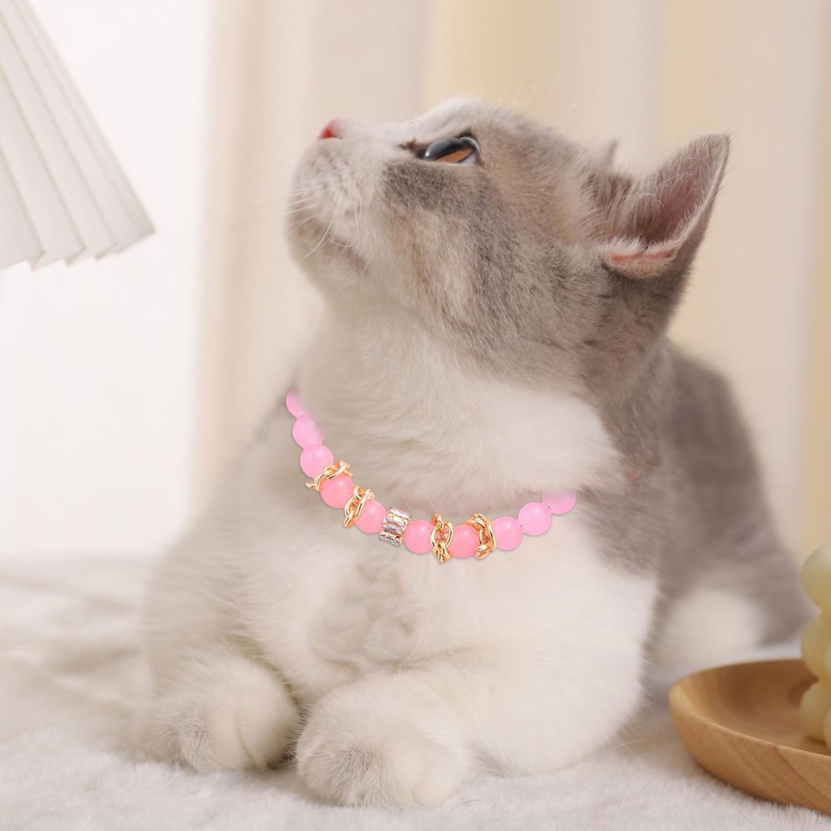 Pet necklace consists of smooth beads, decorated with rhinestones, bright colors and exquisite workmanship. Its size is adjustable and can be adjusted to the size most suitable for pets.