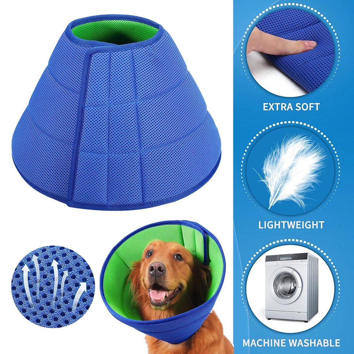 Soft Material: The soft cone for dogs is made of mesh cloth. Thanks to its unique 3D structure, the dog cone is breathable and elastic, not only lightweight but also easy to clean.