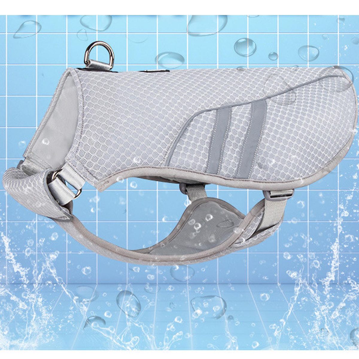 Breathable & Comfortable:Cool fabrics adjust the temperature by quickly evaporating and absorbing heat, bringing cool comfort to pets.Light, breathable and comfortable to wear.Waterproof Design: The inner layer of waterproof material tightly locks the moisture, transmits the cool feeling to your dog, and will not wet the dog hair.Reflective Strip Effect: your pet more safer at night. D shaped metal ring design can attach pet leash.Adjustable: The neck circumference and circumference can be adjusted according to the size of the pet.Use Method:1. Soak the cool coat with cold water before going out. If you want a cooler effect, you can put it in the refrigerator for 10 minutes. 2. Twist the cool coat until it does not drip, and put it on for dog. 3. After the clothes have evaporated to dryness, you can add an appropriate amount of water
