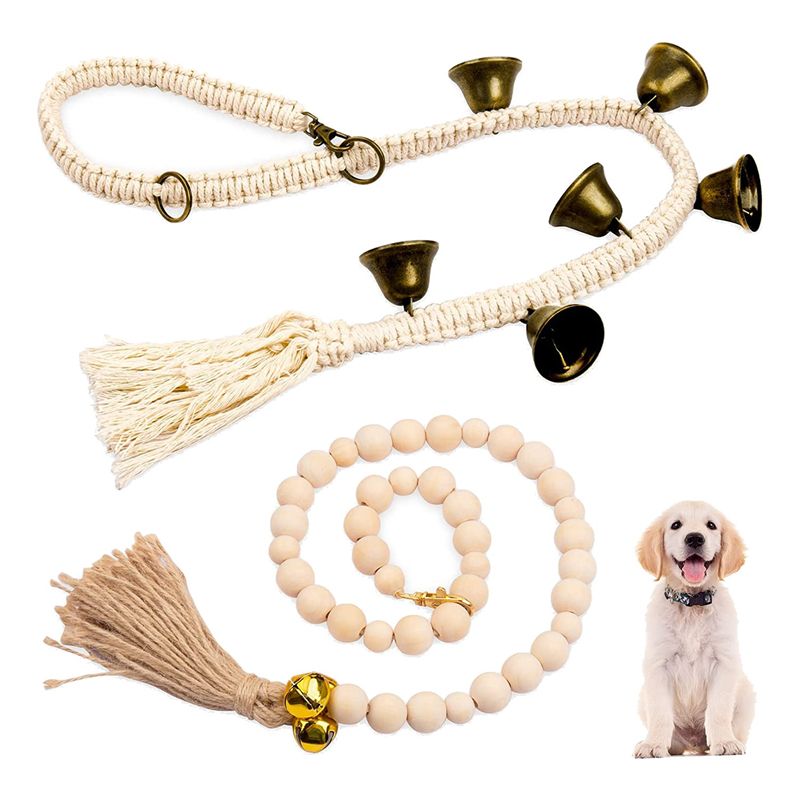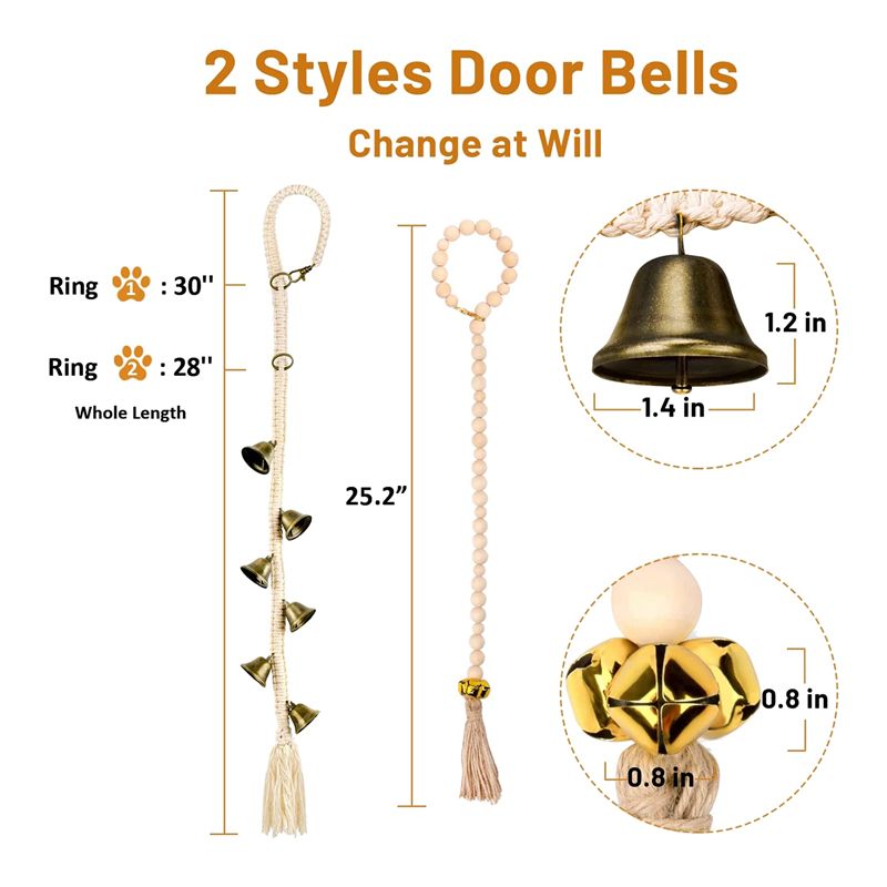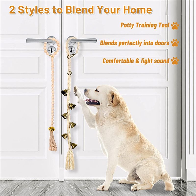 [Adjustable Length & 2 Different Styles] One of the set is made of primary color wooden beads,and the other one is hand woven from premium cotton rope with a beautiful and elegant lace design,their length can be adjusted according to the size of your dog.These 2 door bells come in a variety of styles, beautifully designed, generous and delicate, not only dog training tools, but also unique style decorations that can be freely replaced according to your mood and furniture decoration.