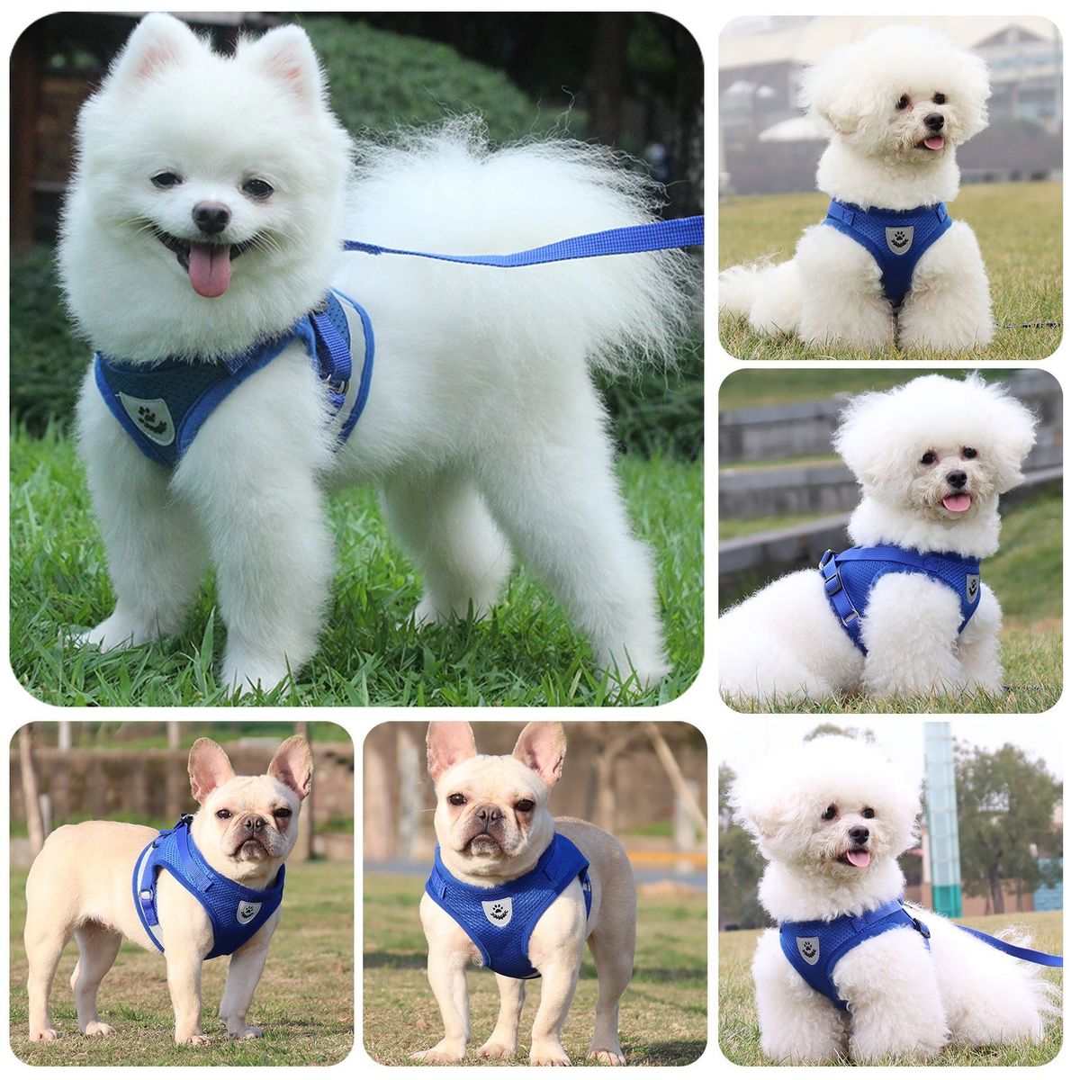Dog harness and leash set for walking small dogs. The mesh fabric and vest style allows efficient air ventilation all year round. Adjustable quick-fastening tape and quick-release buckle bring a comfortable fit. Reflective strip provides safer walking at night. Have it for your puppy pet.