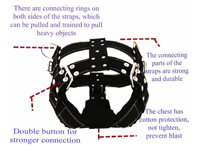 The dog strap is pressed and sewn with tear-resistant cloth, the lower body is added with tear-resistant cotton to improve the dog's comfort, the connecting ring is welded to improve the resistance, and the 4-ring pull ring is used, the left and right pull ring can be used for physical training, pull the sleigh, pull the rickshaw, and the lower pull ring can be used to fix the dog.
