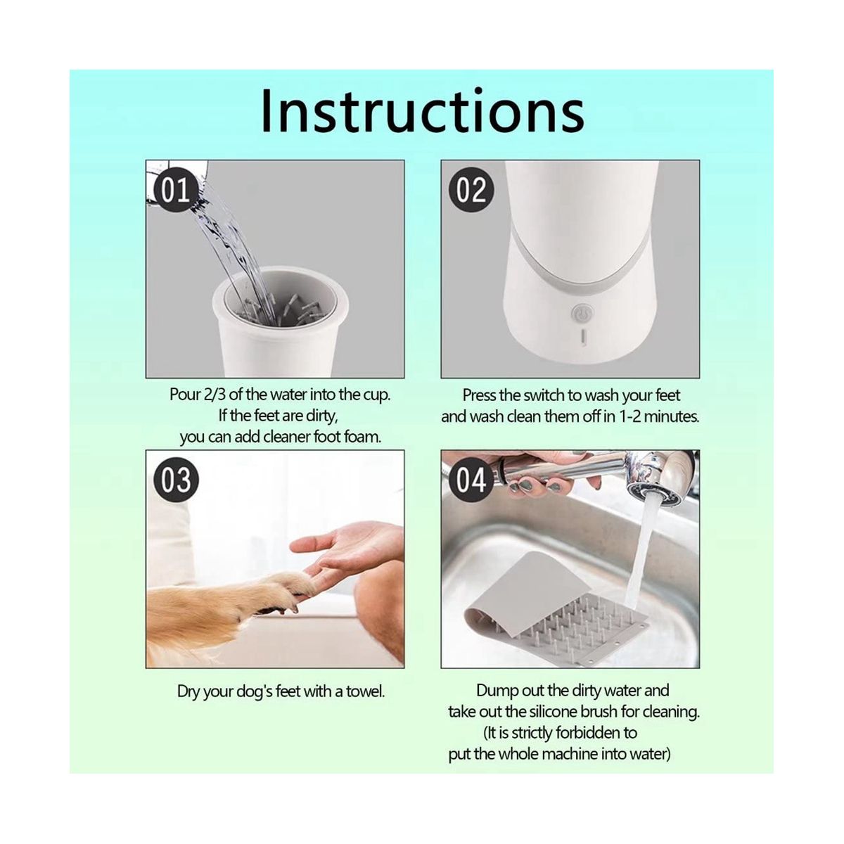 02. Press the switch button to wash your pets feet for 1-2 minutes.
