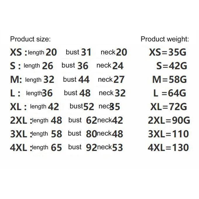 Spe ifi ations: A li able Obje t: Dog Material: Polyester ategory: Dog Su lies Size: Length Bust Ne k ir feren e( m) S 26 36 24 M 32 44 27 L 36 48 32 XL 42 52 35 2XL 48 62 42 3XL 58 80 48 4XL 65 92 53