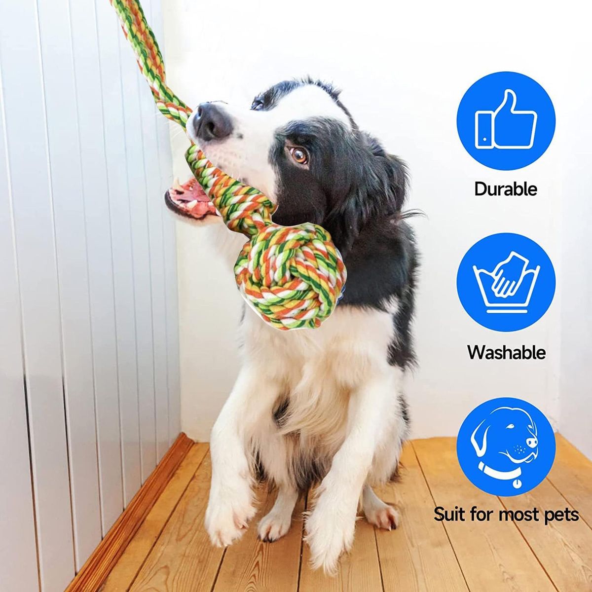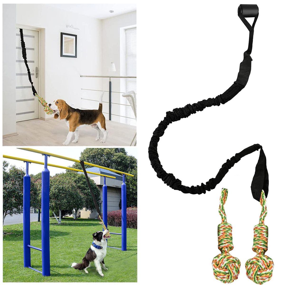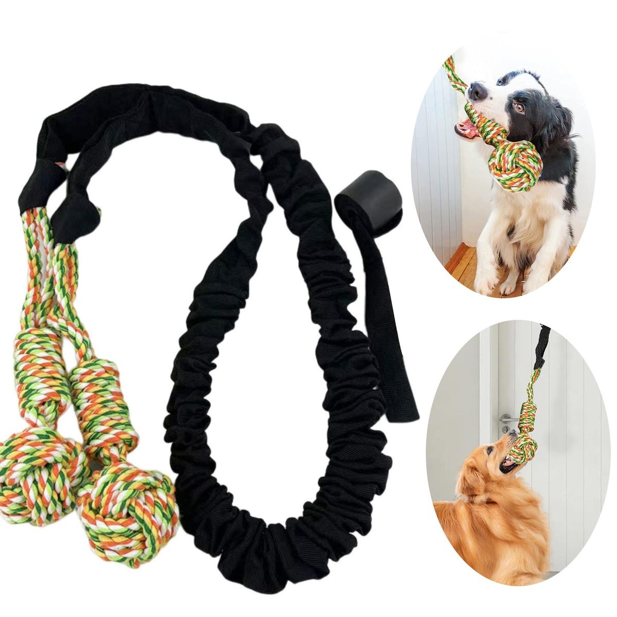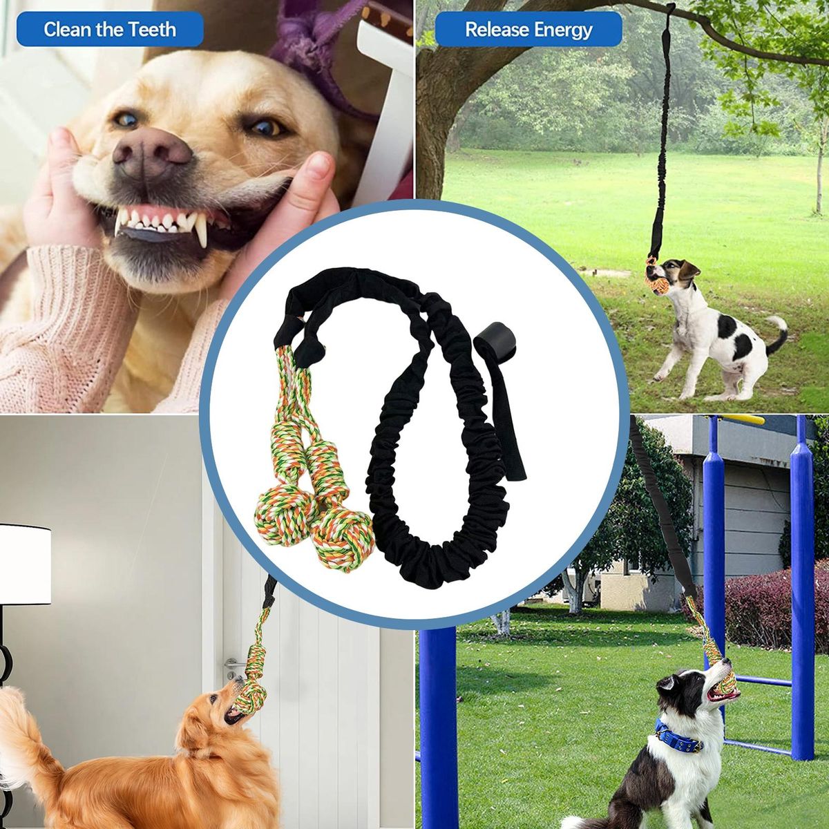 The dog toys are suitable for indoor play and outdoor exercise. Just Hang it on the door or tree, loop it and pull it snug, then it's ready to play.