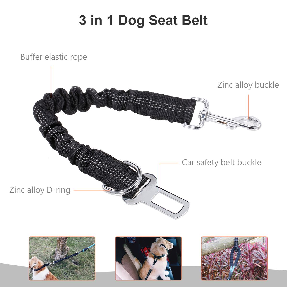 3 in1 Design: D-ring, zinc alloy buckle and car seat belt buckle, 3 in 1. The car seat belt buckle can be inserted into the car, and the other end is used to fasten the pet collar. The D-ring can also be connected to the dog\'s traction rope, and the other end is used to fasten the pet collar. The zinc alloy buckle can also buckle the D-ring to tie the dog.