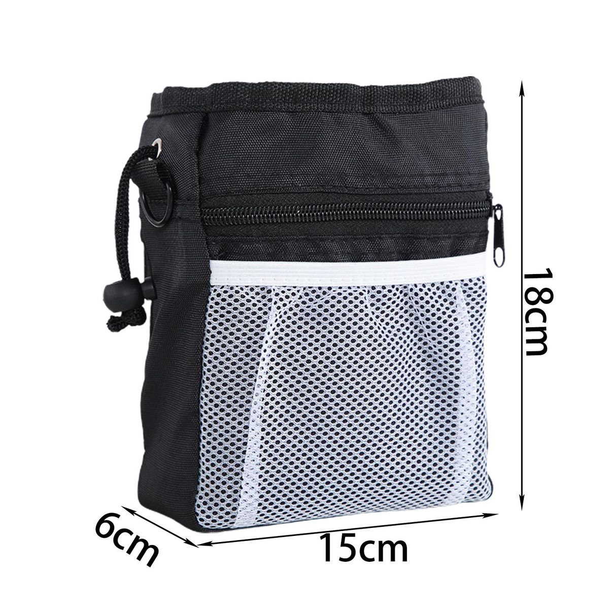 Large Capacity: This treat pouch has a large internal compartment, which can store pet snacks, toys, etc.; you can also store your personal belongings (such as phone, keys, etc.) safely in the front zipper pouch or mesh pocket; the zipper bag on the back is suitable for garbage bag and with a dispenser hole.Durable Material: The dog treat training bag is made of high quality oxford fabric and polyester, wear resistant and waterproof, can keep the bag dry, prevent food from being damp.Adjustable Drawstring: The dog snack bag is equipped with an adjustable drawstring at the top. Convenient to use, and after closing the pouch, you can jog, run, bend over, and nothing will fall.Three Ways to Wear: Adjustable shoulder strap/ adjustable belt with quick release buckle/ Metal clip on the back for clipping on a belt or pants.Easy to Carry: The pet treat pouch for training is very suitable for daily walking and dog agility training. You can take this treat pouch with you when you go for a walk in the park, go shopping, or travel.