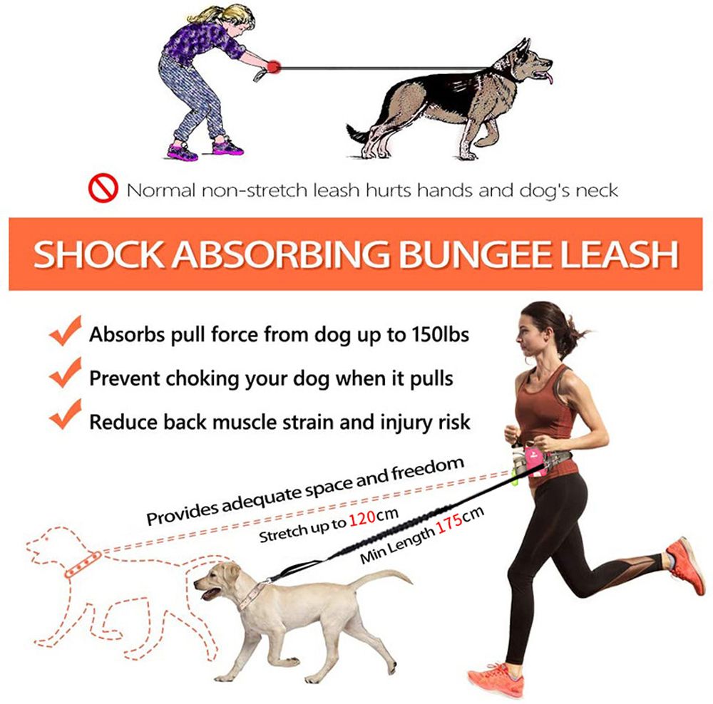 Dual Bungee Construction: The retractable bungee leash can hold dogs up to 150lbs, and can be stretched from 130cm to 180cm, can effectively shock absorb and reduce the stress comes from pulling and tugging, providing adequate room for your dog and you.