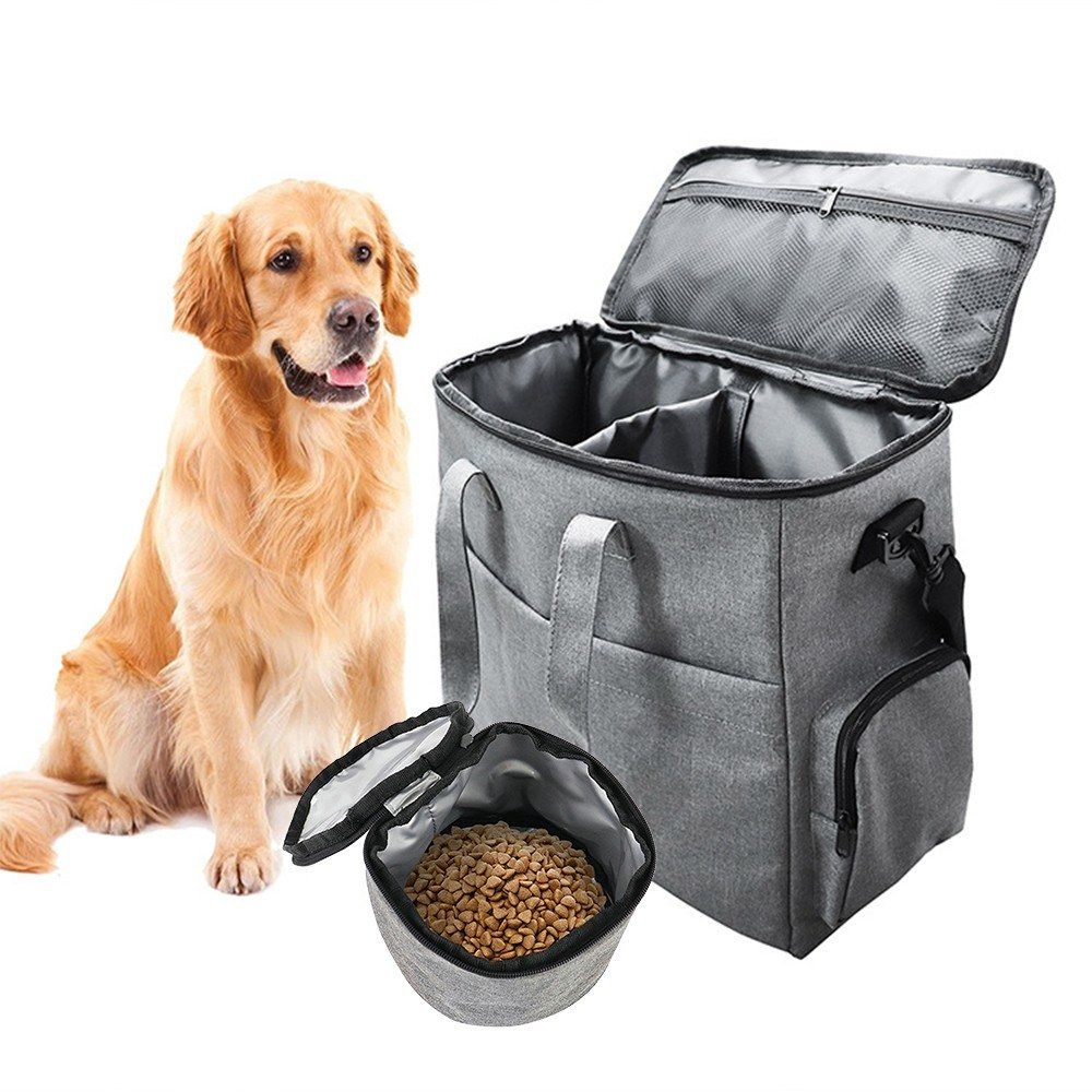 1 dog gear travel bag with multi-pockets and 2 food containers are roomy enough to carry your pet accessories. A great helper for both short and long trips.