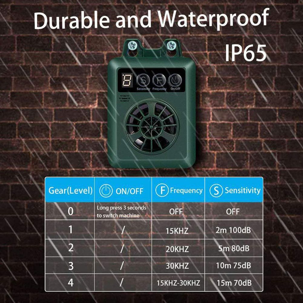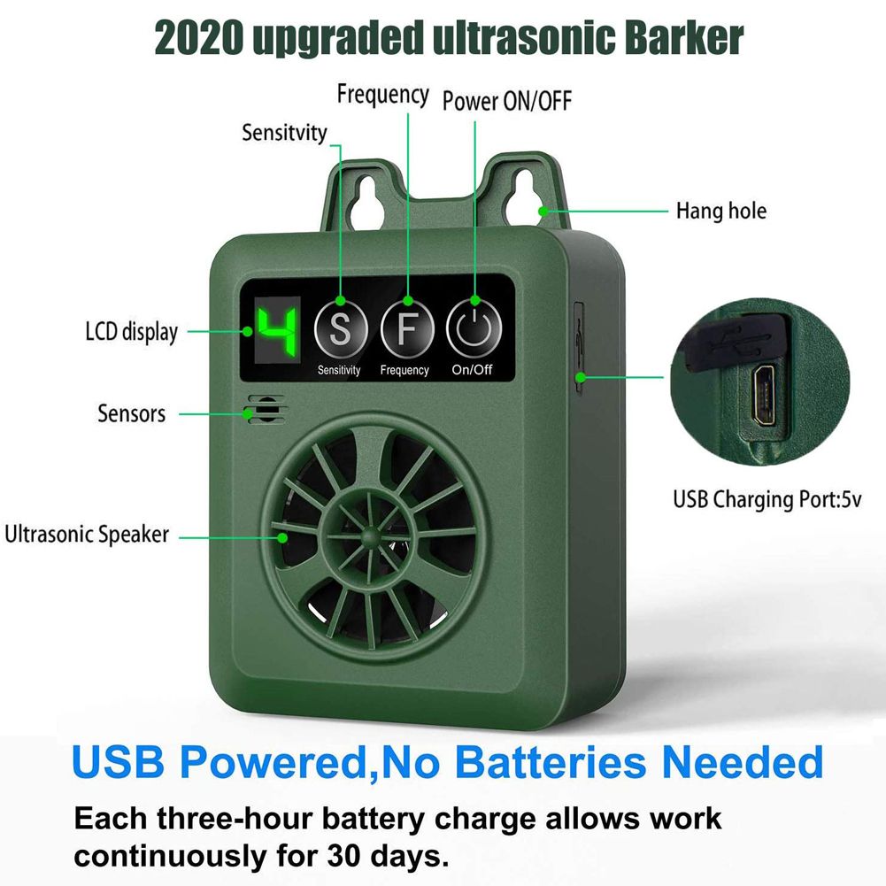Features: Bark-proof controller has a carefully designed mini-shape, which can be hung on trees, indoors, outdoor walls or fence posts to prevent any dog barking (within range), It can be used safely indoors and outdoors in any weather conditions. Built-in pickup to detect dog barking Digital display, rechargeable design. There are 4 frequencies to choose from, for different types of pets or animals. The sensing distance can be selected, the sensitivity can be adjusted. The outer shell of the product is anti- and the outer shell is not easy to fade. IP45 waterproof level. Specification: Working distance: 50 feet / 15 meters 15 / 20KHz frequency is most commonly used for dog barking How to use it : Charging the collar :To charge the device ,Plug the black USB charging cable that is supplied into the bottom of the device and connect it to either a Laptop , PC or power supply that is≤2 amp. The device can be charged in three hours and will work continuously for 30 days . When charging the device ,the digital display will show the power level and continue to flash until it is fully charged .When the product is fully charged ,the digital display will show a"4" . Before turning on the device unplugs the USB charger. Turning the device ON-OFF: To turn device ON pre the"POWER" on down for 3 seconds and it will beep once with the digital display flashing a green number which will then disappear . To Turn device OFF pre the"POWER"on down for 3 seconds and it will beep twice and turn itself off.