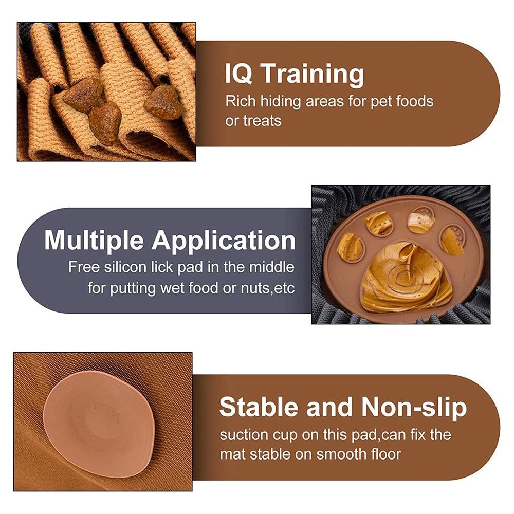 [Environmentally High Quality Material]The middle dog lick pad is made of high-quality food-grade silicone. The dog sniffing mat is made of environmentally friendly materials to ensure that dogs are not harmed when searching for food, and it not be tear into pieces as easily as other materials dog snuffle mat.Because this dog training mat is made with polyester-cotton tape and 500D Oxford cloth at the bottom.