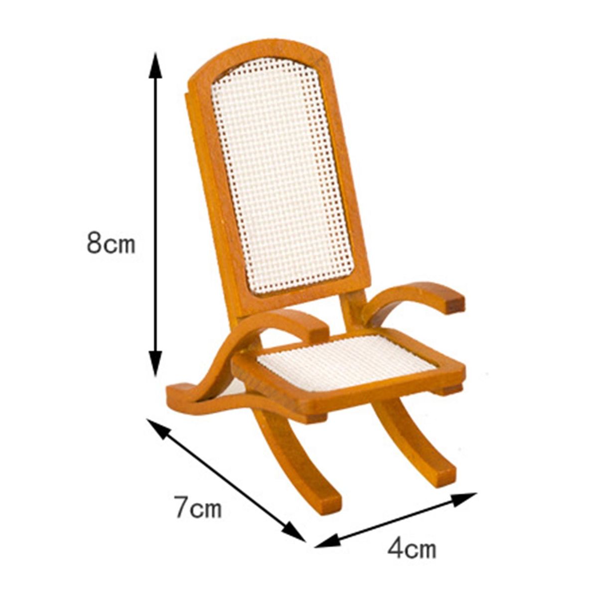 The length of this dollhouse chair is 7cm, the width is 4cm and the height is 8cm.