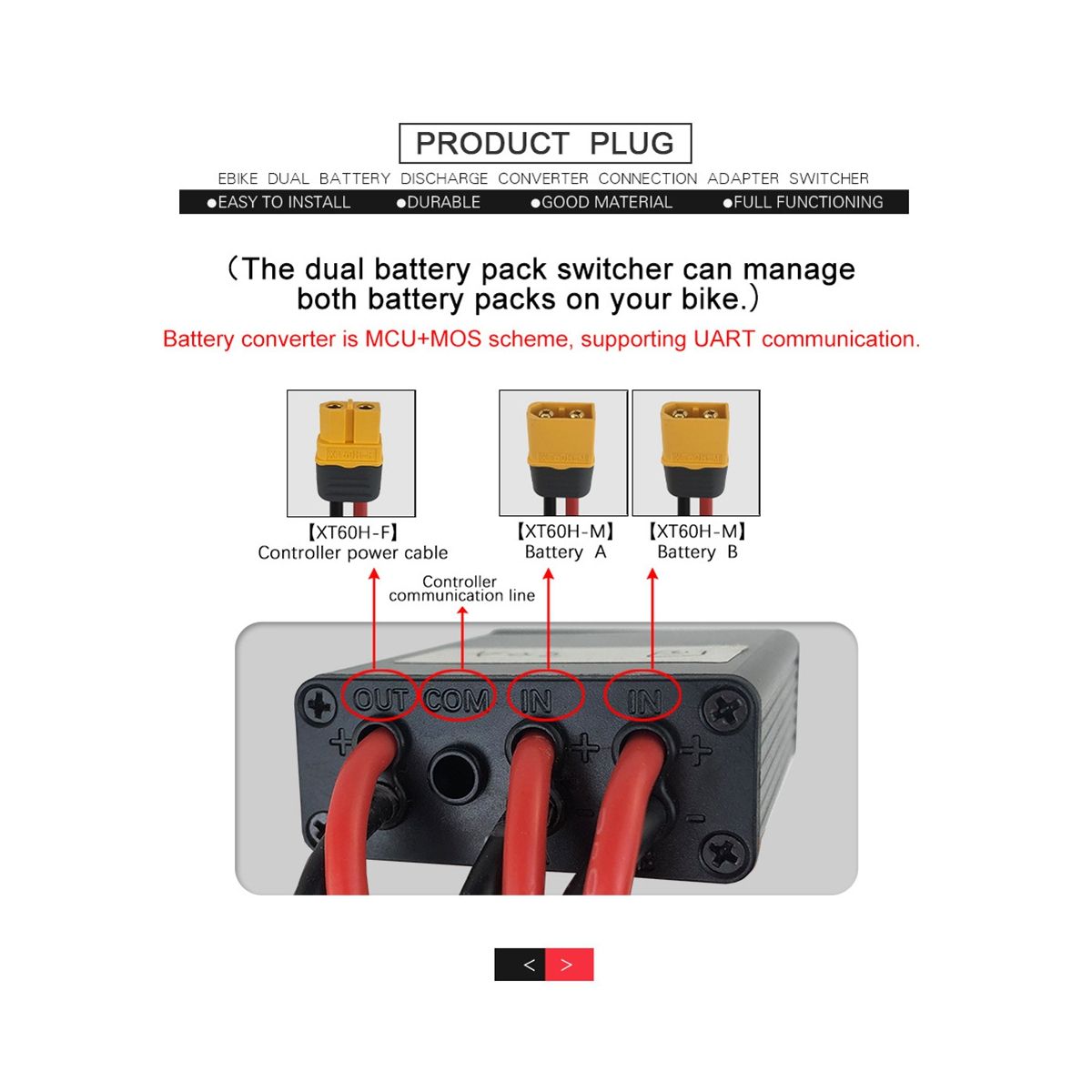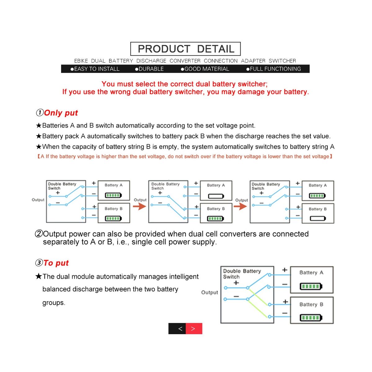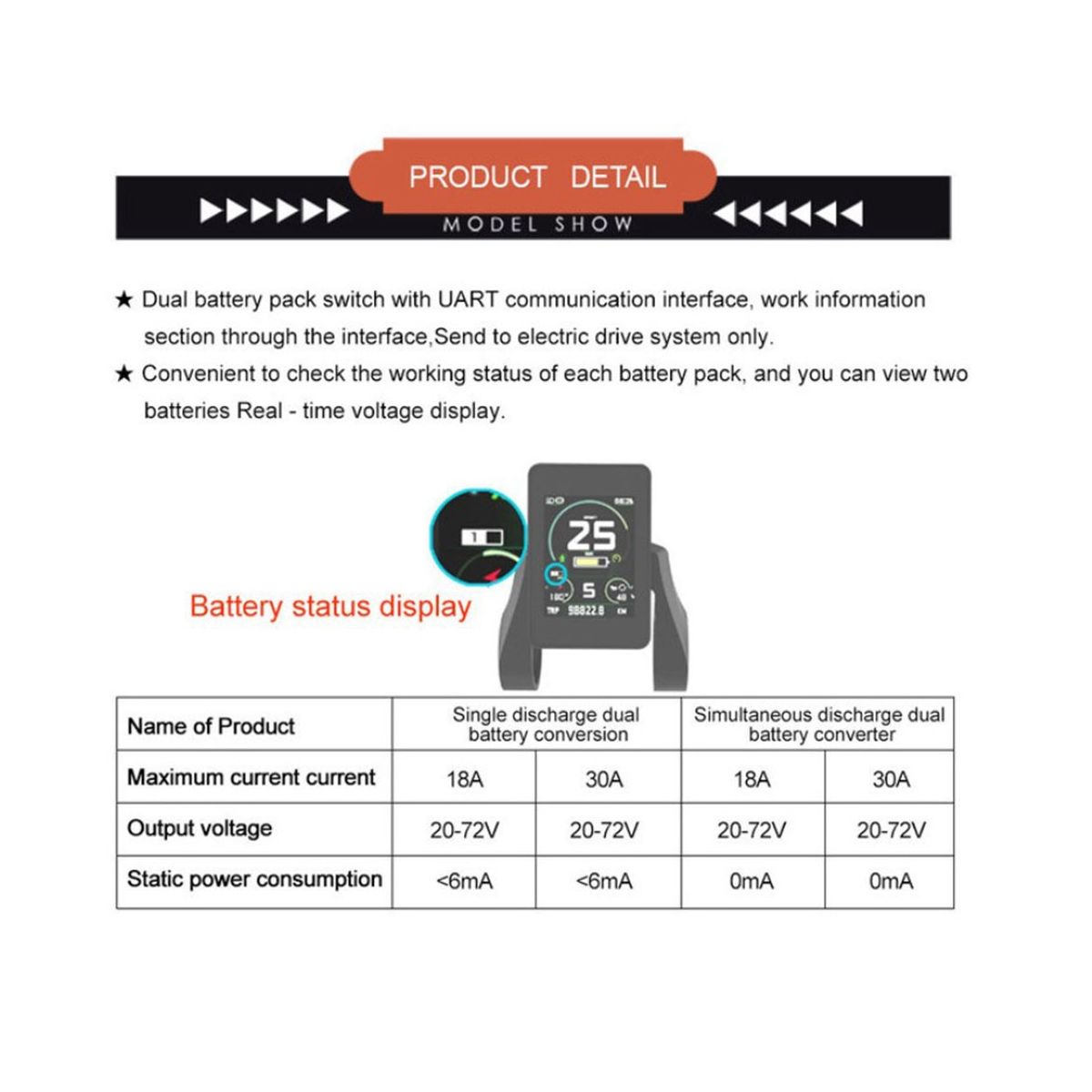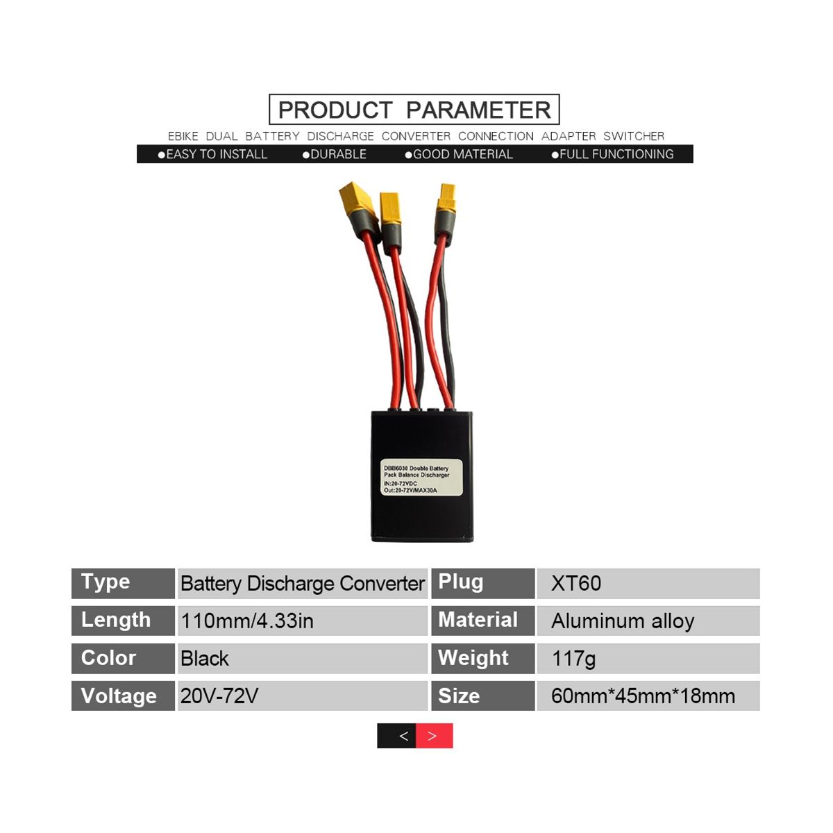Detailed Information About The Product:1. Double battery pack balance discharger can manage two ebike batteries which fixed on your bike, lower power consumption design, real-time detect the voltage of both two battery packs, battery on-line check. The nominal voltage of battery is 20V-72V.