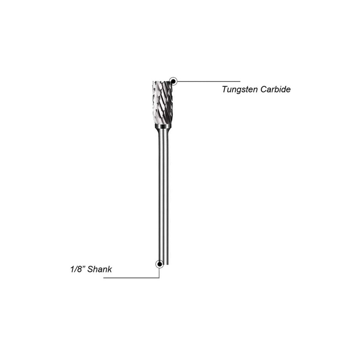 These carbide rotary burr set, with 1/8inch shank is made from Tungsten Carbide. Total Length:45-50mm, Cutting Diameter 1/4inch, Shank Length 35mm, Shank Diameter 1/8inch.