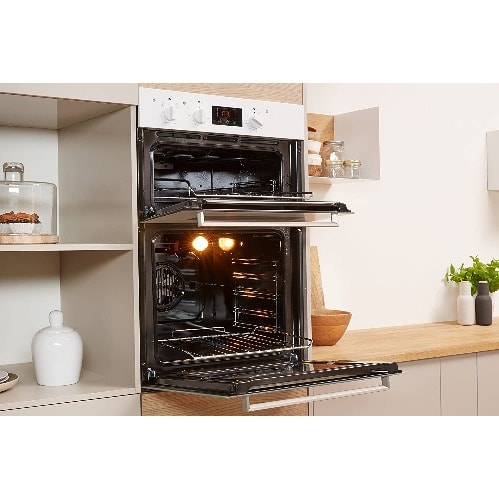 Make more in the kitchen with the Indesit Aria IDD 6340 WH Double Oven in white, bringing great capacity and a co-ordinated modern design to your home. Enjoy 74L of cooking space in the main cavity, perfect for making big family meals and with the power of fan assistance, dishes are evenly heated with less hot and cold pockets. Within the top oven, a further 42L of capacity makes it an ideal space for cooking side dishes and & ndash; with an integrated twin variable grill & ndash; perfect for browning off your food. For extra ease, this model also comes with its own rack and tray set. Featuring enamel liners to provide an easy clean surface for food spits and fat, keep your meals on track with the in-built Digital Timer ensures you won & rsquo;t under or over cook, but get great results every time. A superb all-round set-up for those who love to cook, the Indesit Aria IDD 6340 WH Double Oven gives you space and versatility for all your favourite family meals.