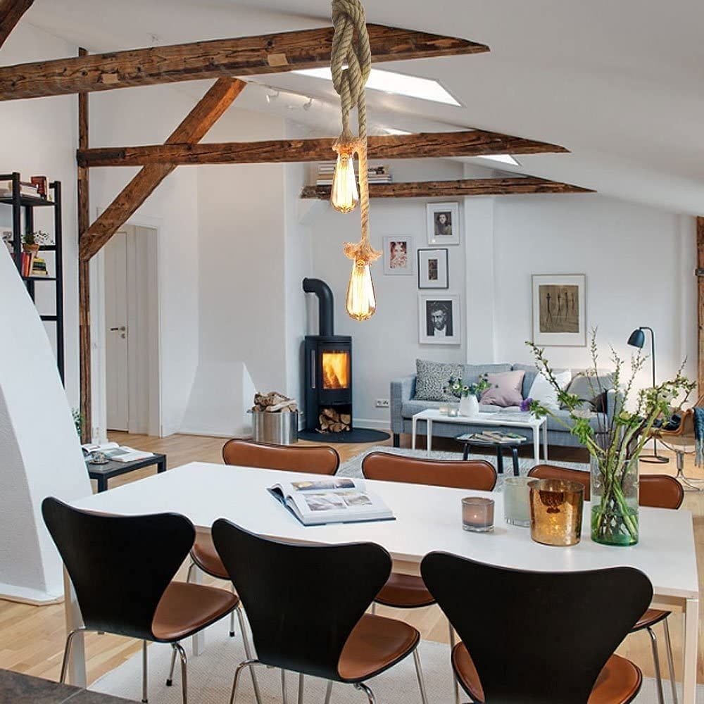 Woven cable suspension light by a large chandelier looks very special ,hemp rope lamp is durable and long lasting.This industrial suspension rope with two E27 bulb screw (bulb not included).