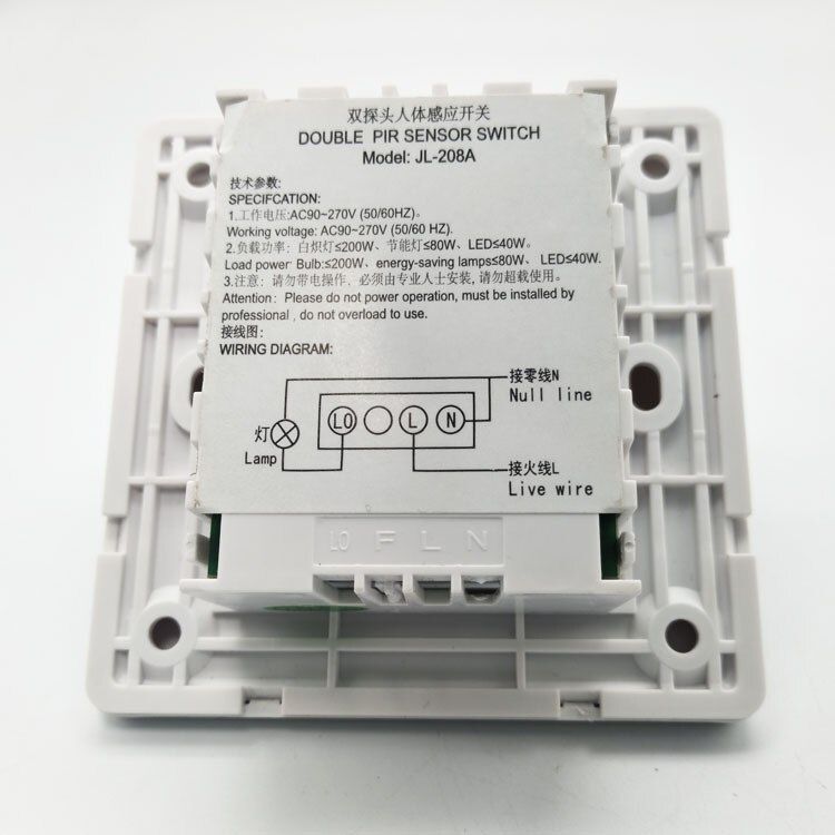 Features: Energy Saving and Envmental Protection This double probe infrared sensor switch uses light-sensitive control, with automatic metering function, the default light is working when the light is dark, adjustable daytime work. The sensor switch can be an automatic lighting of corridors, bathrooms, basements, warehouses, garages, etc., and an automatic ventilation of exhaust fans, and automatic control of other electrical appliances, etc. You can conveniently to let the light auto on/off. The switch can detect human bodys infrared, and use infrared to control the load, which is easy installed and used. Specifications: Quantity: 1pc Material: Plastic Color: Working Voltage: AC 90V~270V, 50/60HZ Load Power: LED ≤ 40W, Energy-saving lamp ≤ 80W, Incandescent lamp ≤ 200W, Exhaust Fan ≤ 50W Standby Power: ≤0.0088W Delay Time: The default is about 20 seconds, 15~300 seconds is adjustable Sensitivity: 3LUX~2000LUX adjustable Sensing Distance: Default 1~8 meters, 2~10 meters adjustable Induction Angle: More than 180 Degrees Package included: 1x Switch