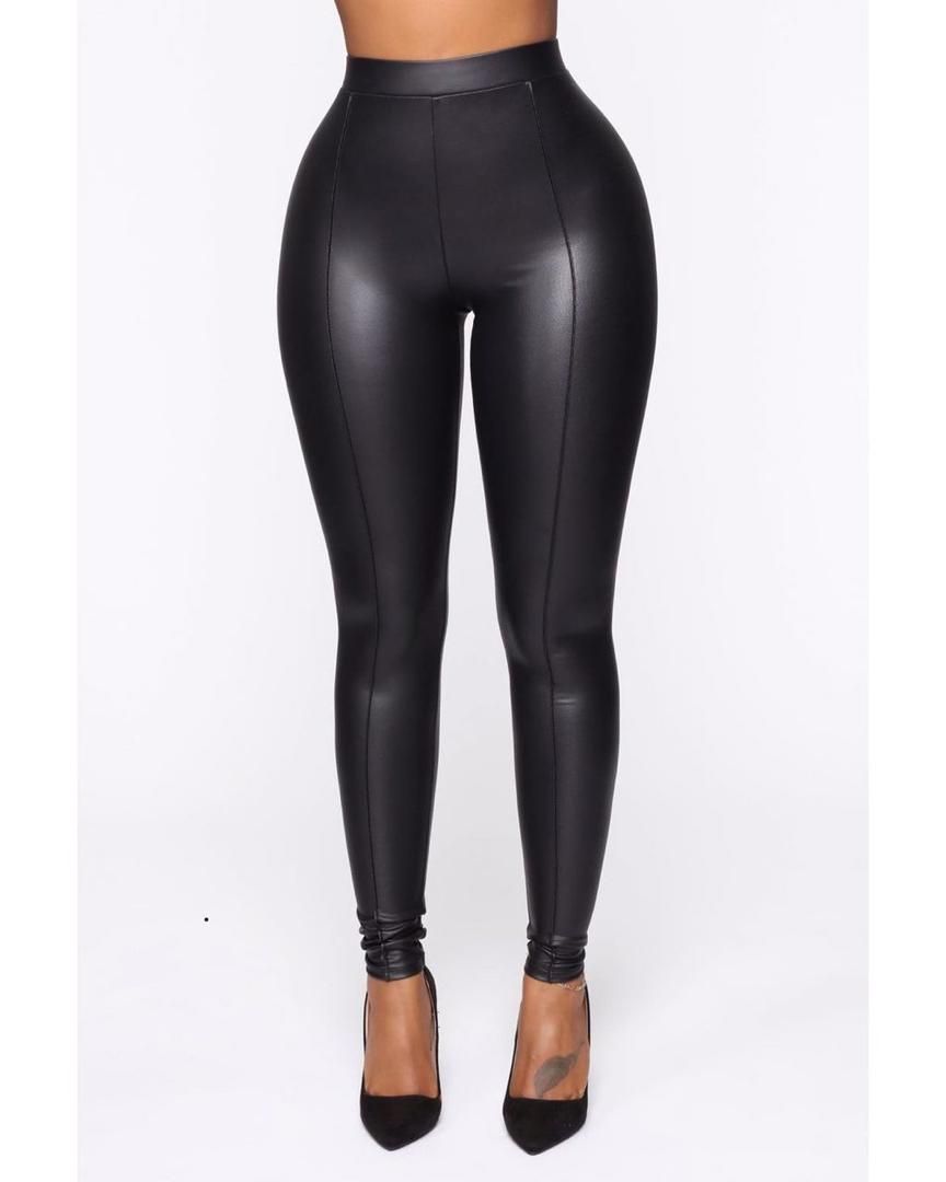 These leggings are a staple in every girl's wardrobe. Featuring a black faux leather material and a front seam detail, we love this teamed with a snake crop top and clear mules for a chic attire this weekend.
