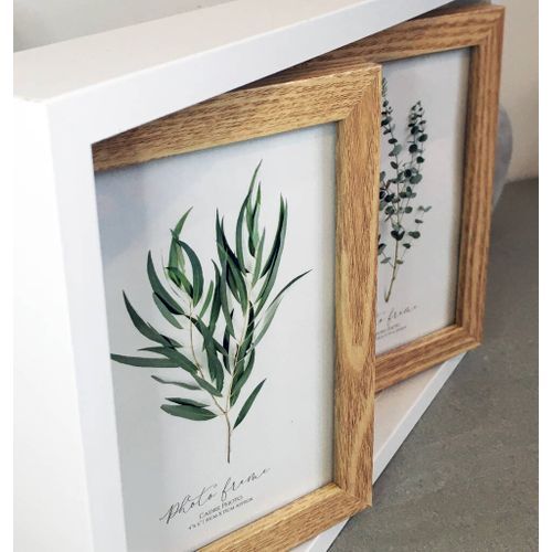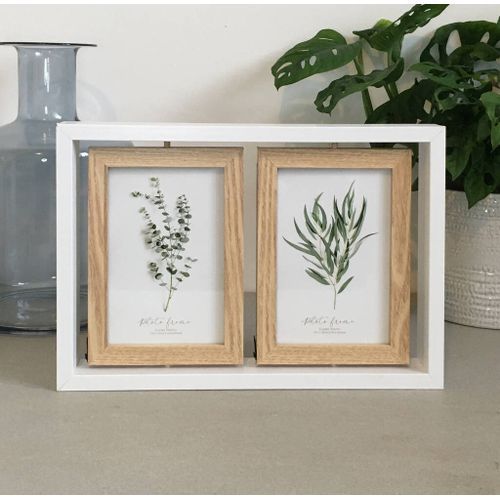 A white wooden picture frame with two rotating wooden oak veneer picture holders.