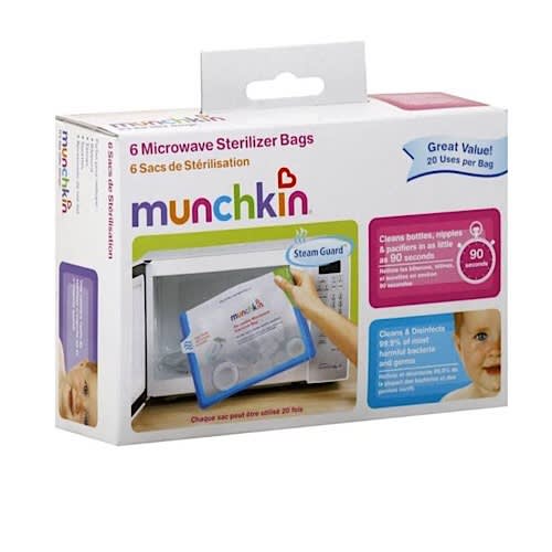 Re-usable Steam Guard bags are handy and dandy. Whether you're on the go or at home, these microwave sterilizer bags are a quick and easy way to kill up to 99.9% of bacteria and germs on bottles, nipples, pacifiers and breastpump accessories. And don't worry about burning your hand when removing the bag from the microwave ? we've designed the pouch with a special Cool-Touch grip for burn-free handling. At Munchkin, we try to think of everything.
