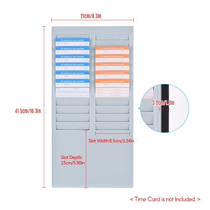 Features:24 time card pockets, 1 slot for 1 card, can hold up to 24 cards of your attendance time clock, usually used in office, factory, warehouse, etc.