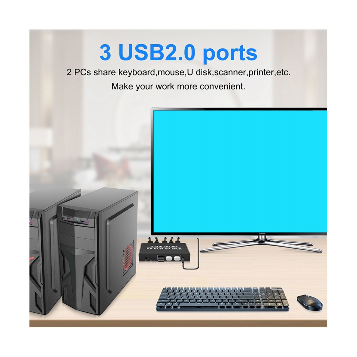 With 3 ports USB 2.0 interfaces for sharing USB2.0 devices,such as printers, keyboards, mouse, USB flash drives,etc. Do not need to plug and unplug time when using.