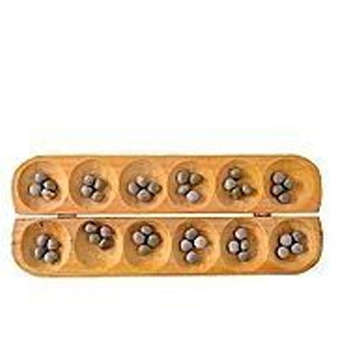 is played by two people, facing each other, over two rows of six pockets, or holes in the ground. Each player places four seeds or tones in each of their six pockets and the players then take turns of picking up all of the pieces from one of the pockets and dropping one of them into another pocket one by one.