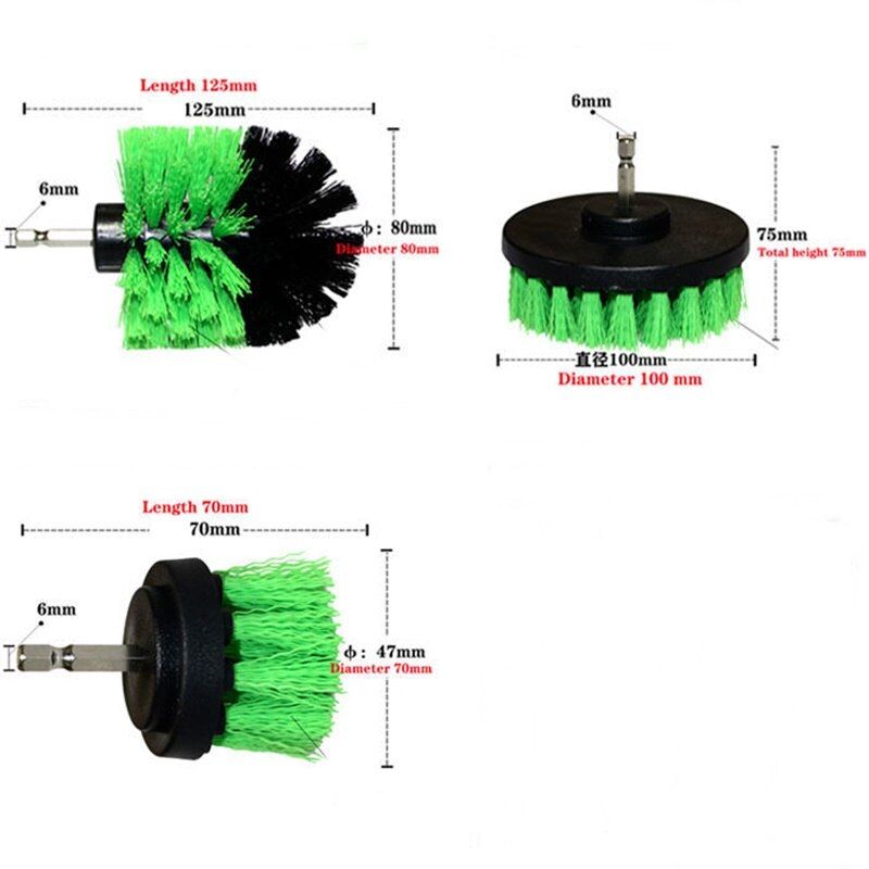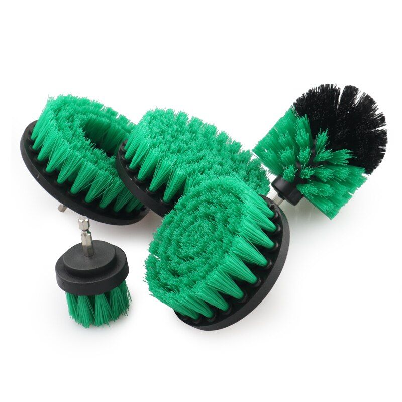 Features: 3 different sizes and shapes of brushes for cleaning around your bathroom surfaces. These nylon bristles will not scratch and can be used on car, gla, tubs, tiles, sinks, carpet, baseboards, fibergla shower enclosures, shower door tracks, and porcelain. All brushes have quarter inch QUICK CHANGE shafts, Cordle drill NOT included Drill NOT include.