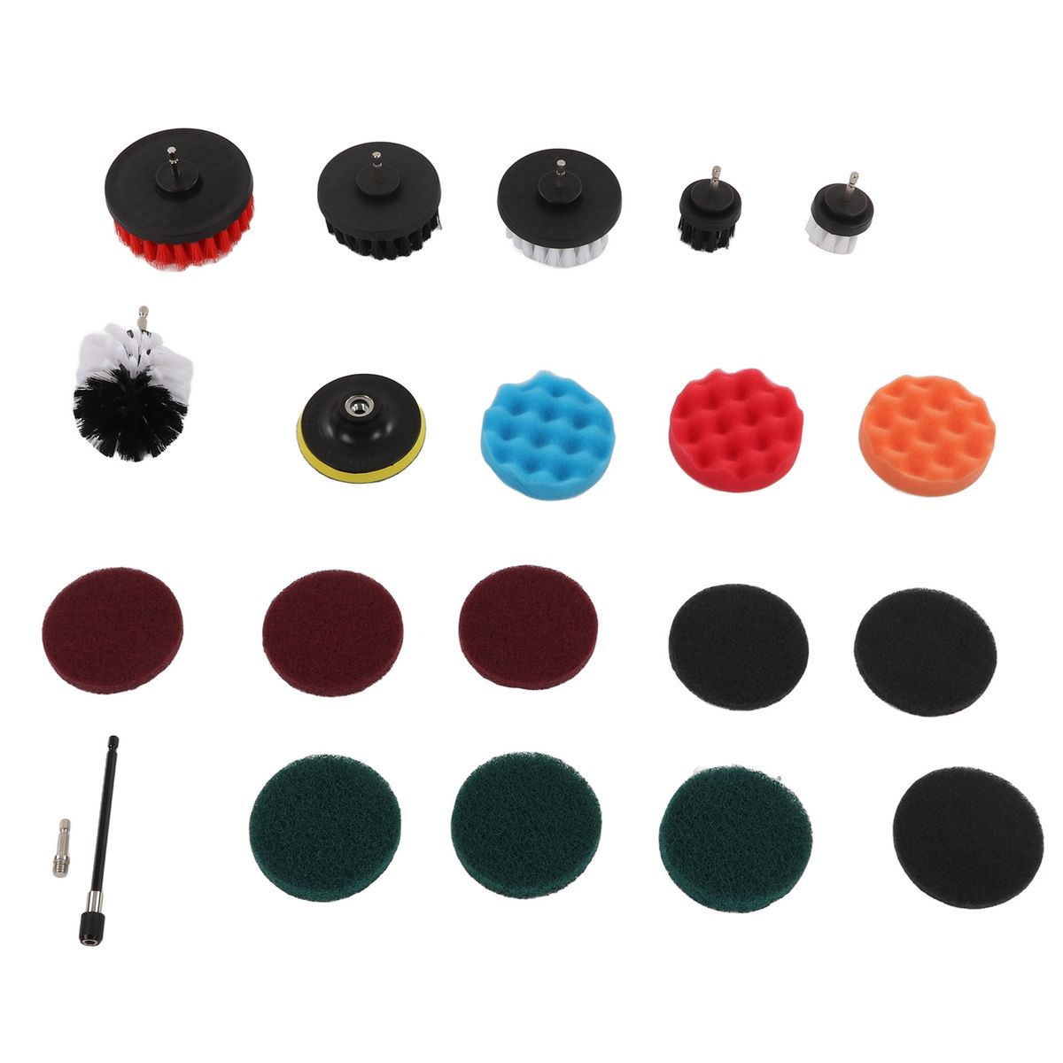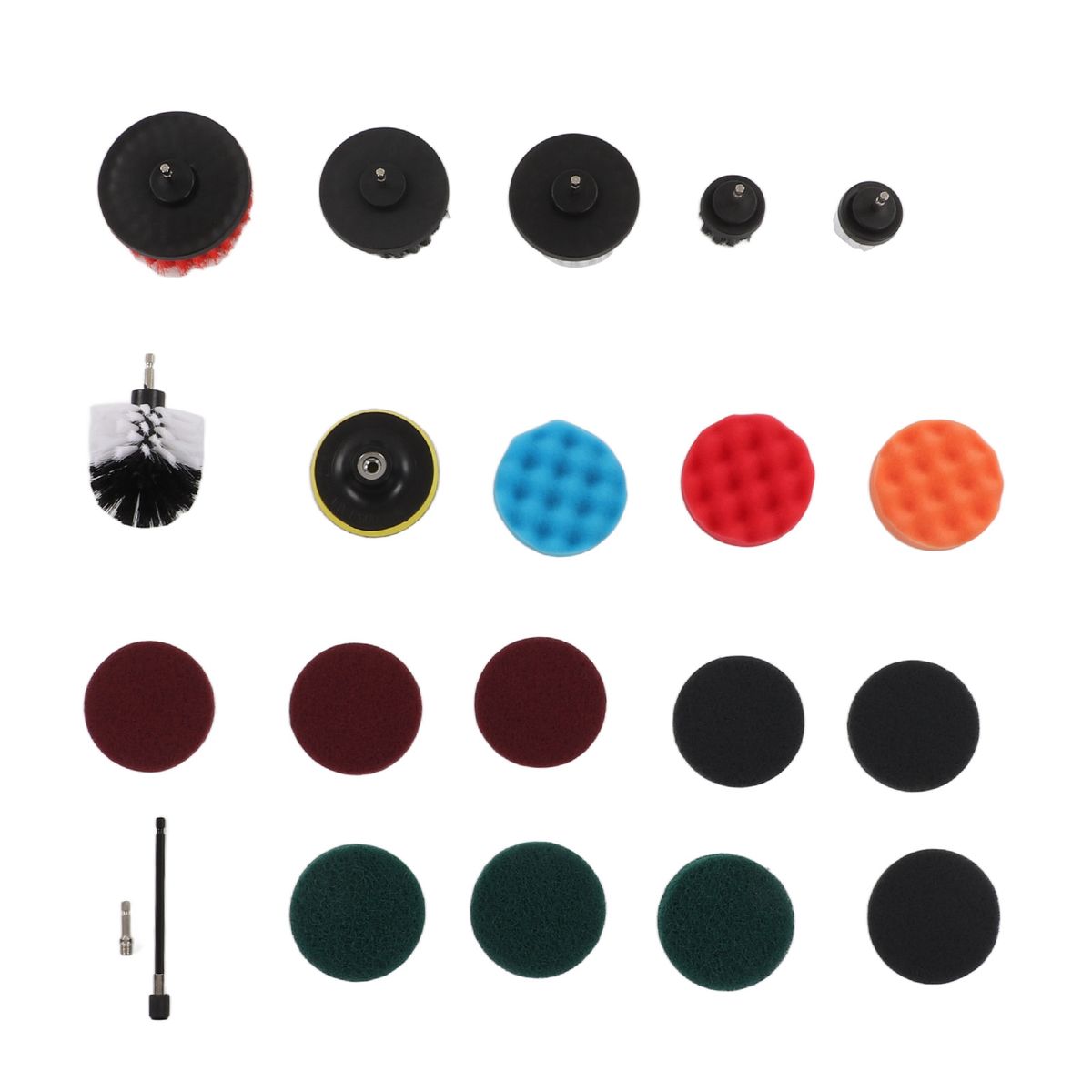 Package Contents: The drill cleaning set includes 6 shaped medium drill power scrubbing brushes, 9 scouring pads of varying hardness, 3 scrubbing sponges and 4in backing and 1 extension rod.