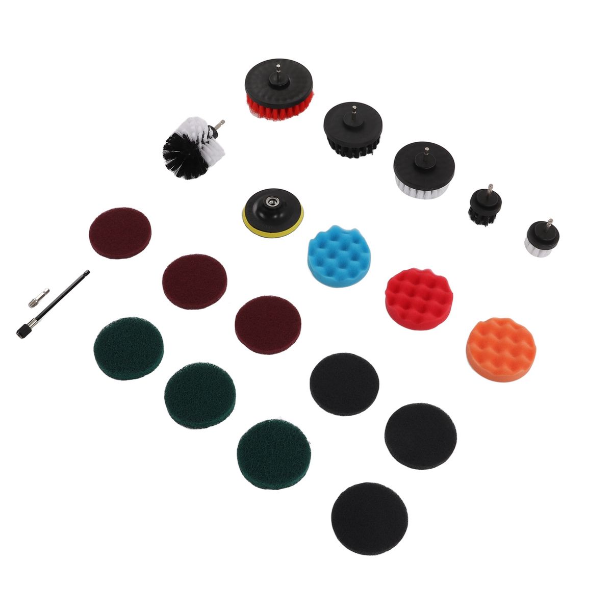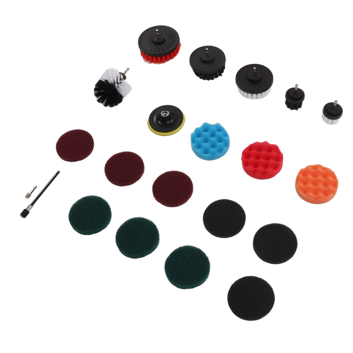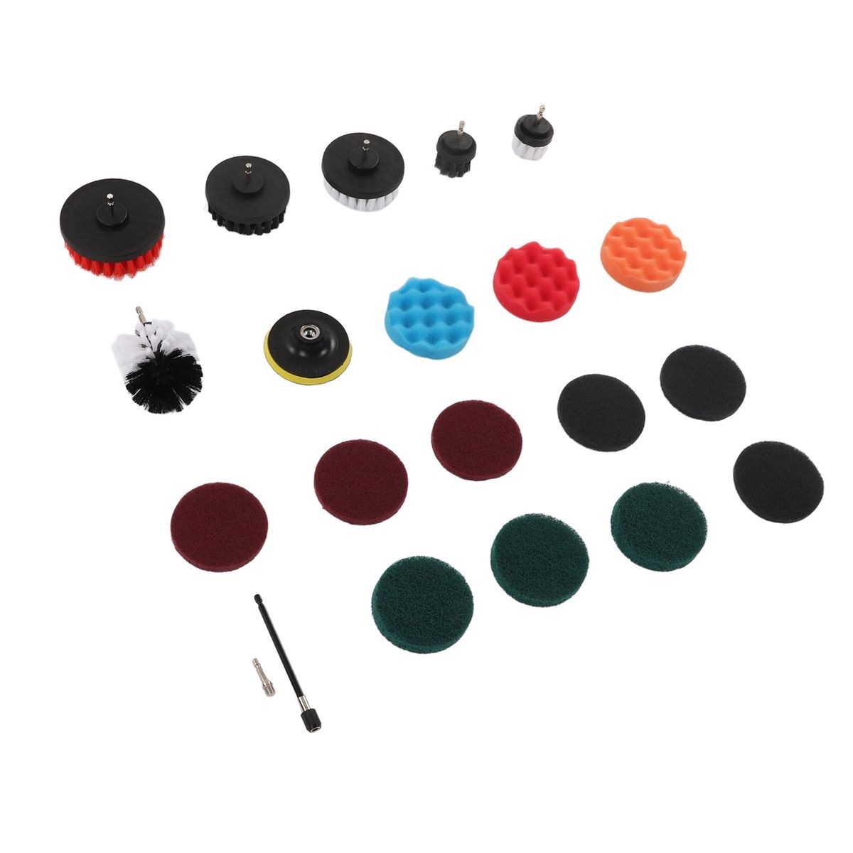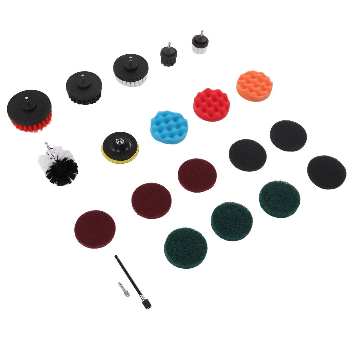 Feature:1. Package Contents: The drill cleaning set includes 6 shaped medium drill power scrubbing brushes, 9 scouring pads of varying hardness, 3 scrubbing sponges and 4in backing and 1 extension rod.