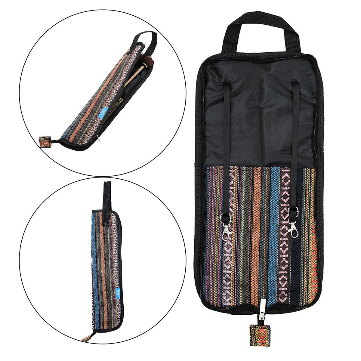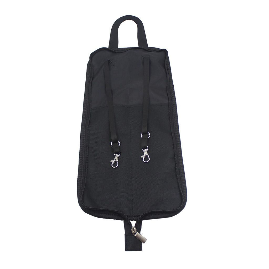 Water-resistant and durablePadded and soft-sided design, with cotton inside(approx.5mm in thickness), protect sticks from bumps during transport and carryingCan be on drum with two inside straps, drummer can take sticks easily during performanceTwo separate compartments for storage - main zipped compartment for sticks(8 pairs at least); the other for sheet music, straps, and other accessoriesGripped handle on the side ensures bag can be carried easilyMaterial: Oxford cloth