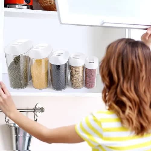 Kitchen Storage & Organization, 10 piece 5-Containers & 5-LidsClear See Thru PlasticStore Spices, Pastas, Cereal , Snacks & More, Keeps Food fresh and Insect Free1-1440ml 8", 1-960ml 7.25", 1-720ml 6.25" ,1-480ml 5.5", 1-300ml 4.75"Assorted Color Lids , Ergonomic Design for Easy Pouring