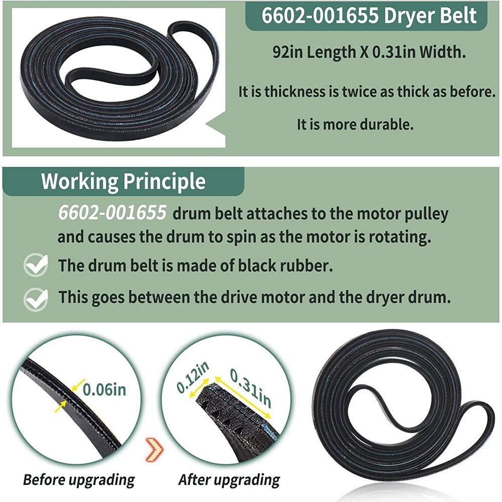 Detailed Information About The Product:PREMIUM QUALITY: The upgraded samsung dryer repair kit made of premium quality material. The rollers are strong and wear-resistant, which make the dryer run stably and quietly. The 6602-001655 dryer belt 92 inch Length X 0.3 inch Width. It is thickness is twice as thick as before and it is more durable. The center of the idler has a triangular design, which is more firm and stable. Non OEM parts but meets OEM manufacturing requirements.