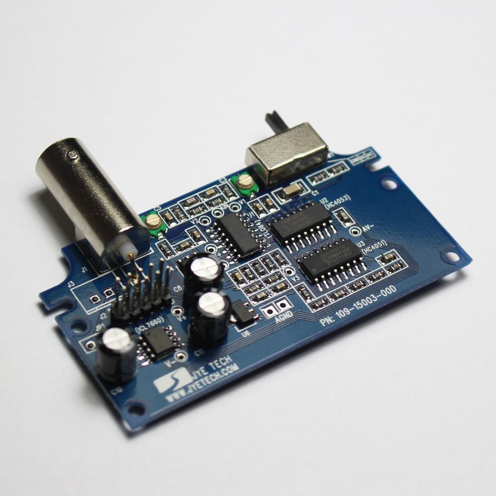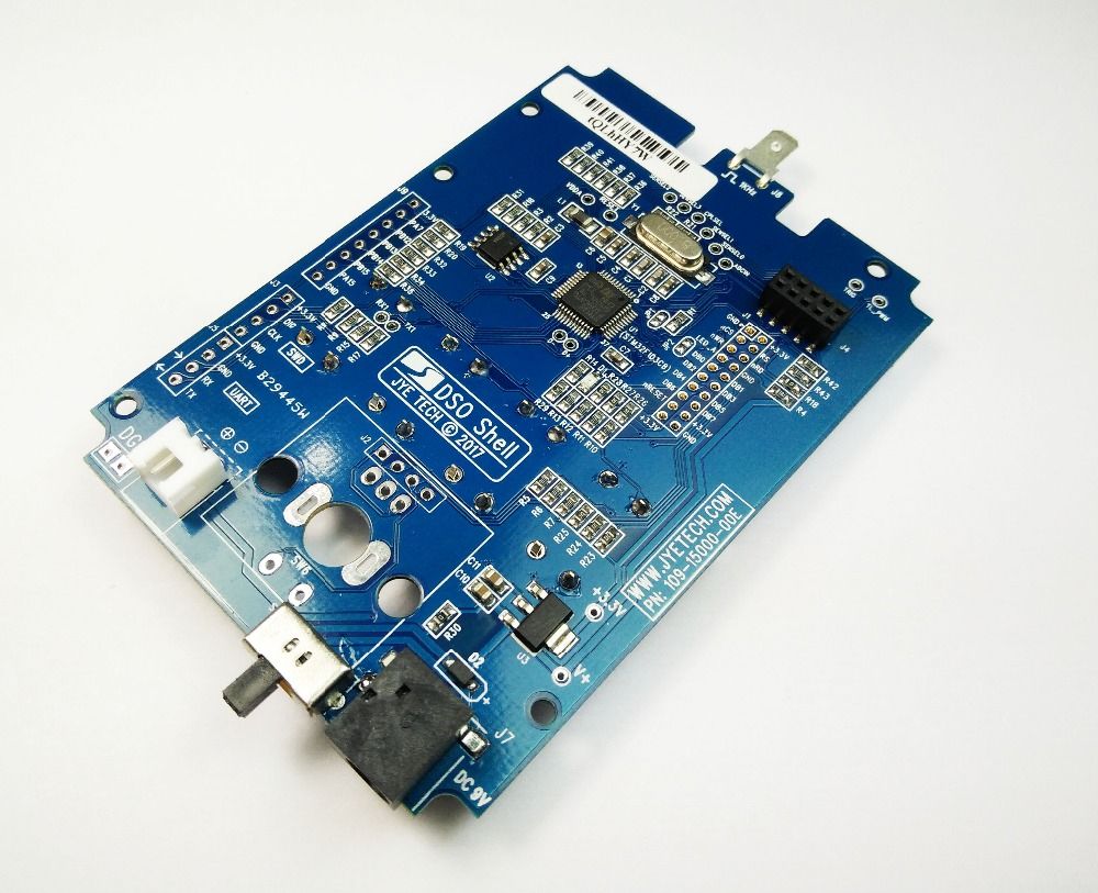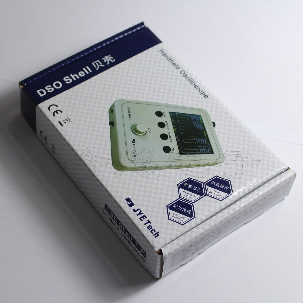 1. DSO Shell has similar bandwitch as DSO138 but contains significant improvements in structure, mechanical, and operation.Display and MCU are now mounted on the same board (mainboard) to avoid using inter-board pin-headers. Feedback from DSO138 usres have shown that soldering on the pin-headers are on problematic for many beginners. Analog channel is placed on a separated board which contains most user install parts. This brings in better separation between analog and digital circuits. Without the analog portion the mainboard is actually a general purpose control board that can be used in many other applications. The mainboard is fully installed (except a few through-hold components) and factory tested before packing. 2. DSO Shell comes with full enclosure. The front panel and top/bottom brackets are flexiable for easy user modification. 3. Rotary encoder has been added. It makes parameter adjustment much quicker and easier. 4. The sensitivity of DSO Shell has been extended in both directions and is higher and wider than DSO138. It reaches 5mV/div --- 20V/div while DSO138 is only 10mV/div --- 5V/div. Specification Vertical Number of Channel: 1 Analog : 0 - 200KHz Sensitivity: 5mV/Div - 20V/Div Sensitivity error: < 5% Resolution: 12-bit Input Impedance: 1M Maximum Input voltage: 50Vpk Coupling: DC, AC, GND Horizontal Max Real-time Sampling Rate: 1Msps Timebase: 10us/Div - 500s/Div Record Length: 1024 Trier Trier Modes: Auto, Normal, Single Trier Types: Rising/falling edge Trier Position: 1/2 of buffer size fixed Display 2.4-inch color TFT LCD with 320 x 240 resolution Power Supply 9V DC (8 - 10V acceptable) Supply Current: 120mA @ 9V Physical Dimension: 102mm X 75mm X 22mm Weight: 100 gram (not including cables and power supply) Package 1* DSO shell oscilloscope 1 *BNC standard probe 1*UserManual(English) Tech Support Forum: www.jyetech.com/forum Pictures of product
