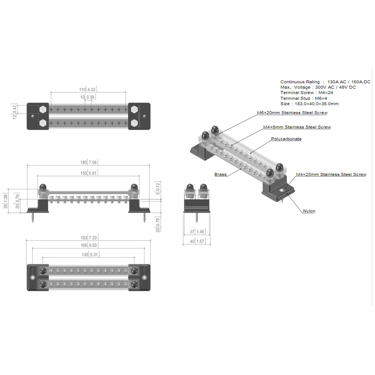 Continuous Ratin: 130A AC/150A DC; Max Voltage is 300V AC/48V DC; Terminal Screw: M4 x 24; Terminal Stud: M6 x 4.