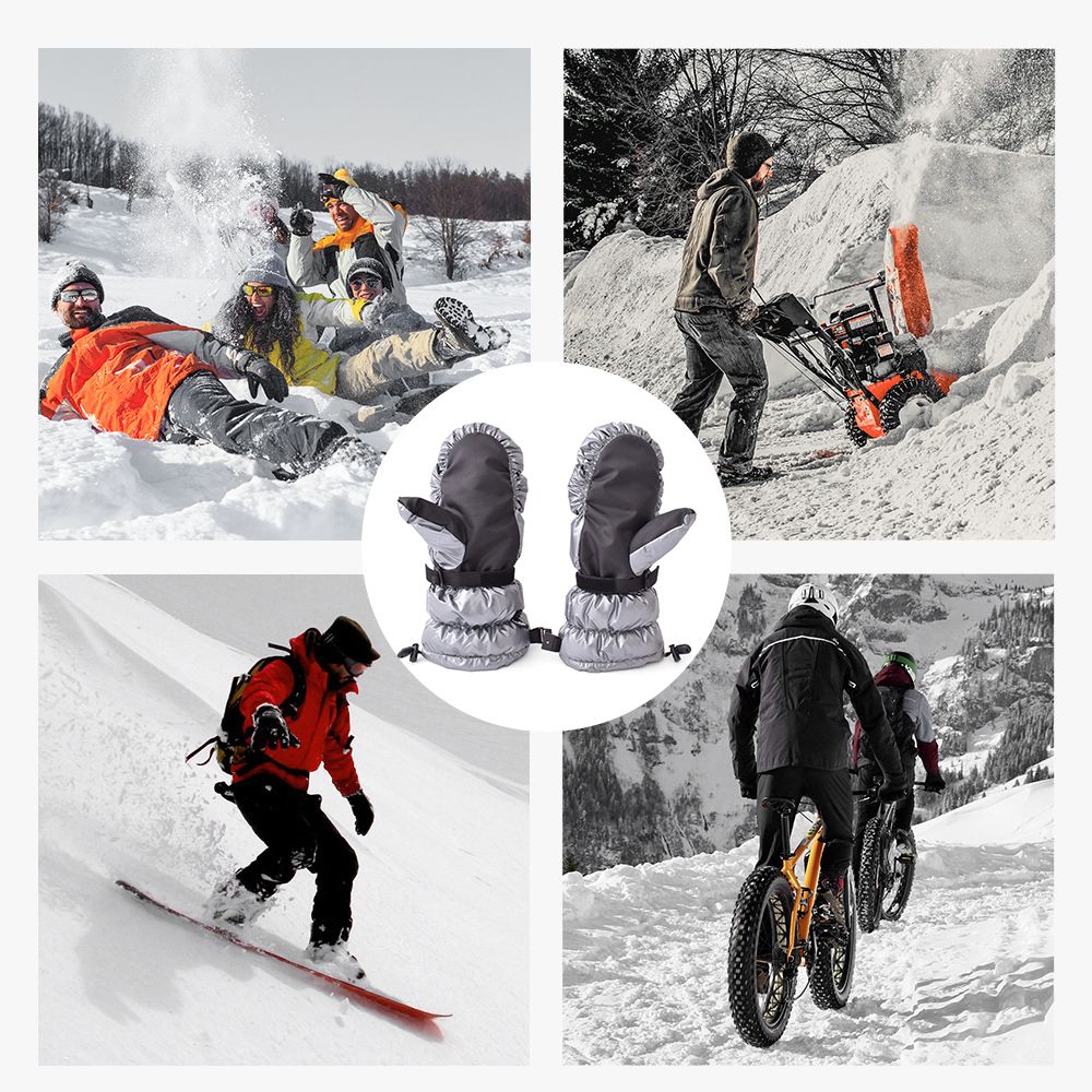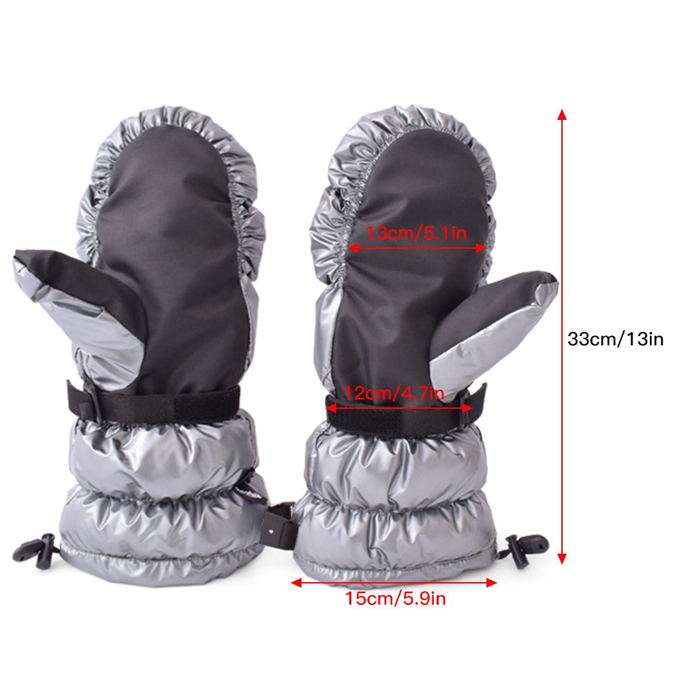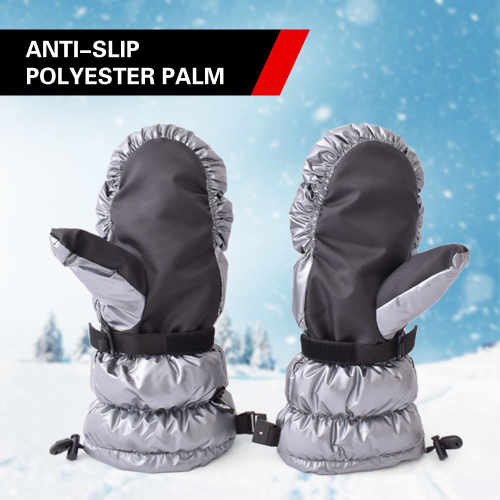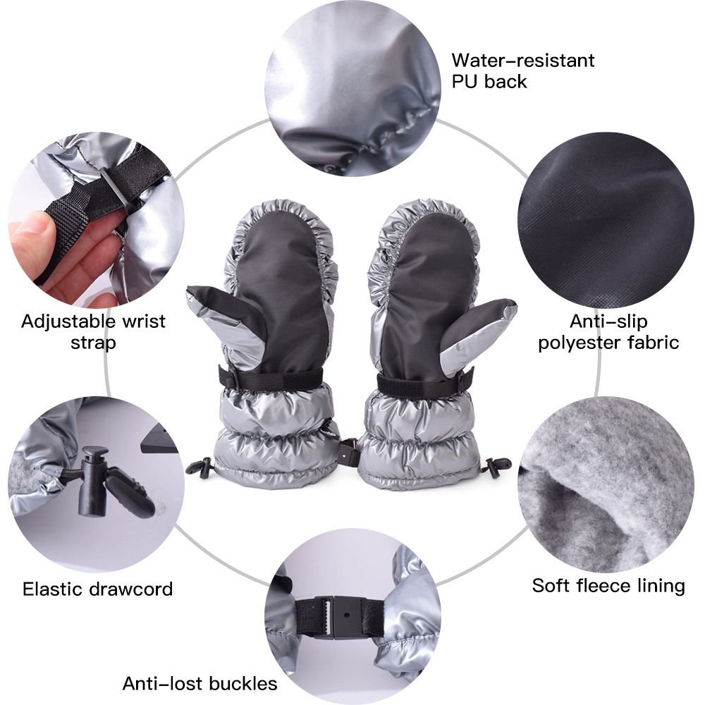 Adjustable wrist straps and elastic drawcord provide a snug fit and prevent cold wind entering the gloves.