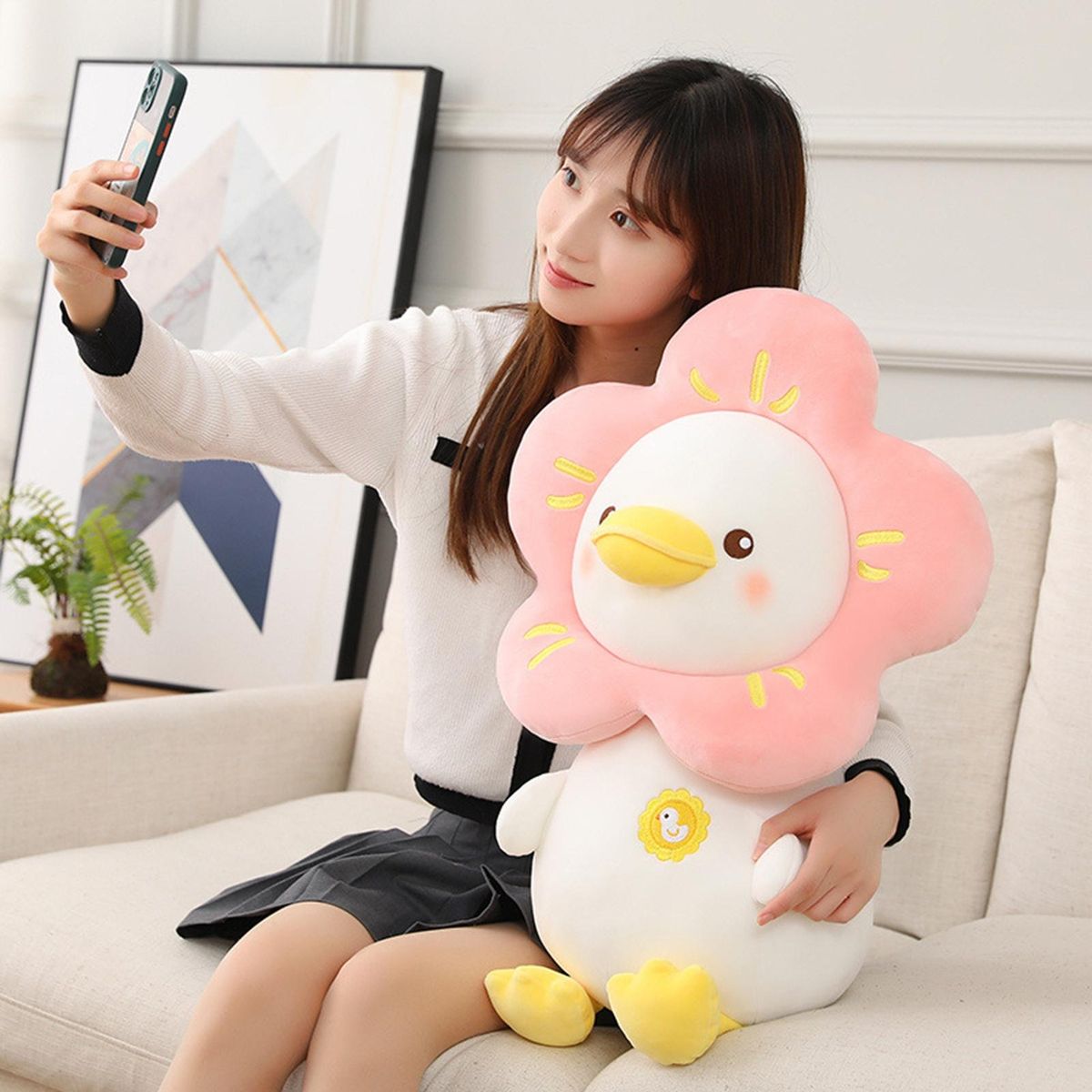 Duck plush toy with cute flower design and vivid expression, not only can be suitable for baby appease sleeping, but also is a perfect decoration for sofa, computer desk, bed, table, etc.