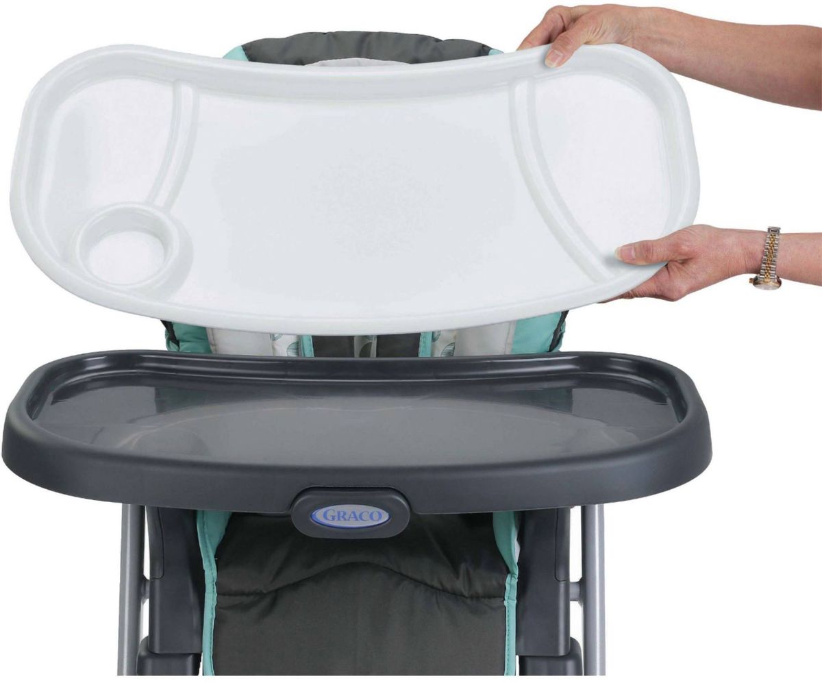 Removable tray has 4 locking positions to grow with baby and can be removed with one hand