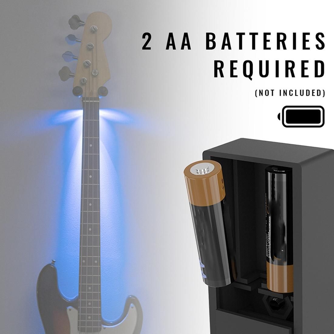The guitar wall mount utilizes two AA batteries(not included) to power the LEDs. You can mount your Guitar wall mount bracket anywhere you want because it does not need AC power.