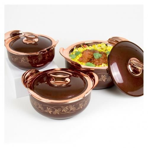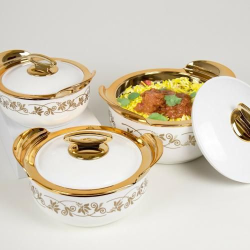 3pc Set CasseroleSize: 1200ml+2000ml+3000mlLiner Double Wall InsulatedRetains Original Taste and Flavor of FoodMade for Many usesretains heat for up to 6 hoursMade in the uk