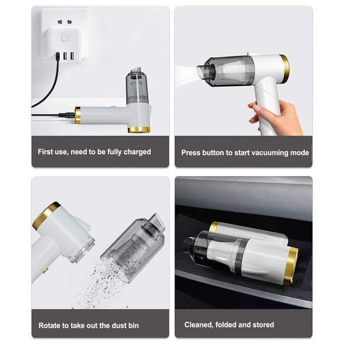 This vacuum cleaner is rechargeable. The red light is on when and the green light is on when full. There is a gravity baffle in the vacuum cleaner. When cleaning, the gravity baffle can prevent dust particles from falling. Equipped with a 120ml visual dust box, it is convenient for you to clean in time. A variety of scenes can be used, and the dust cleaner can clean a variety of dirt. It is a good helper for cleaning.